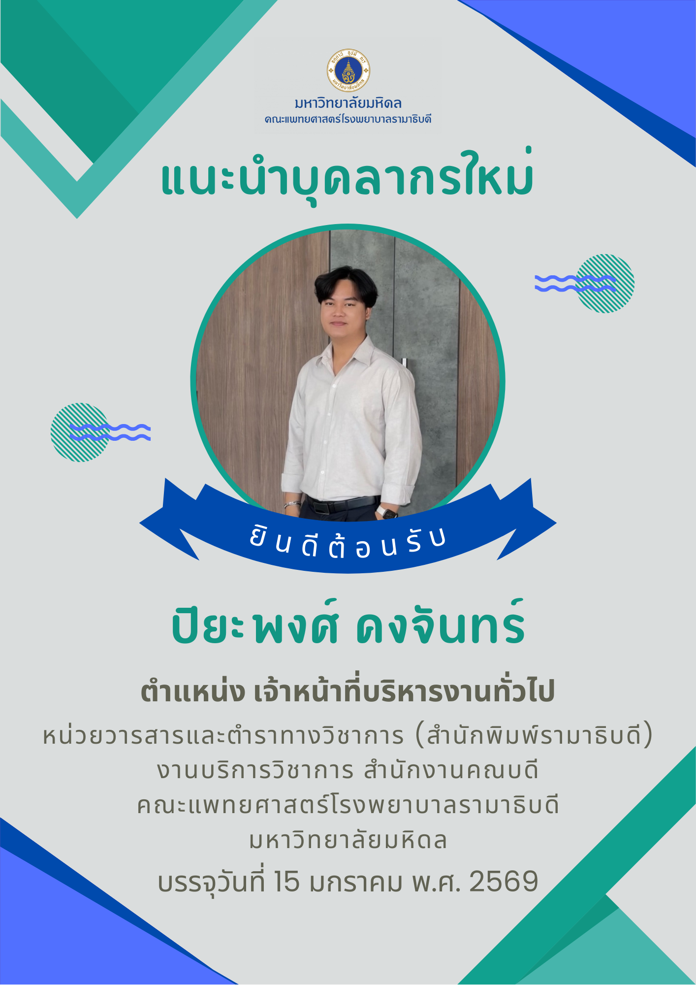 คณะแพทยศาสตร์โรงพยาบาลรามาธิบดี มหาวิทยาลัยมหิดล ขอแสดงความยินดีและขอต้อนรับบุคลากรใหม่