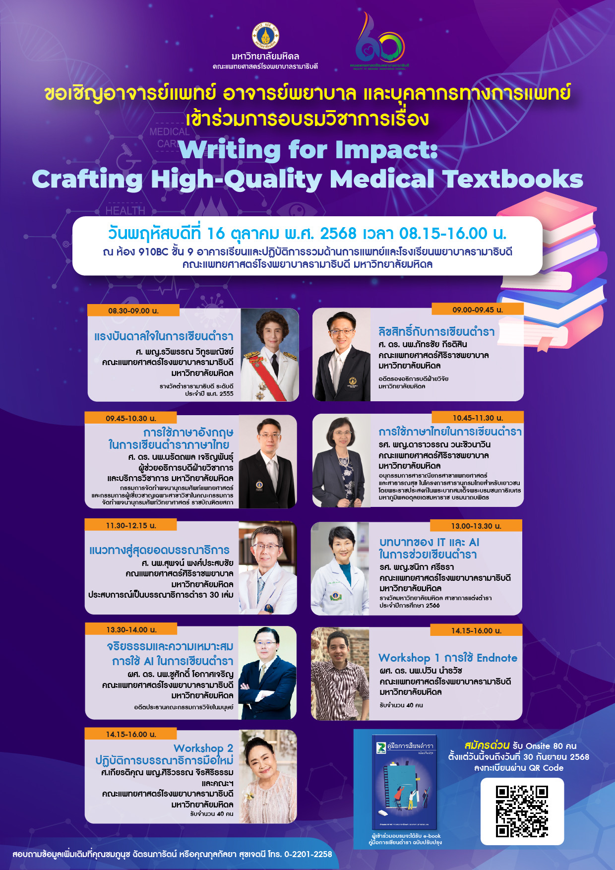 ขอเชิญอาจารย์แพทย์ อาจารย์พยาบาล และบุคลากรทางการแพทย์เข้าร่วม การอบรมวิชาการ เรื่อง “Writing for Impact: Crafting High-Quality Medical Textbooks”