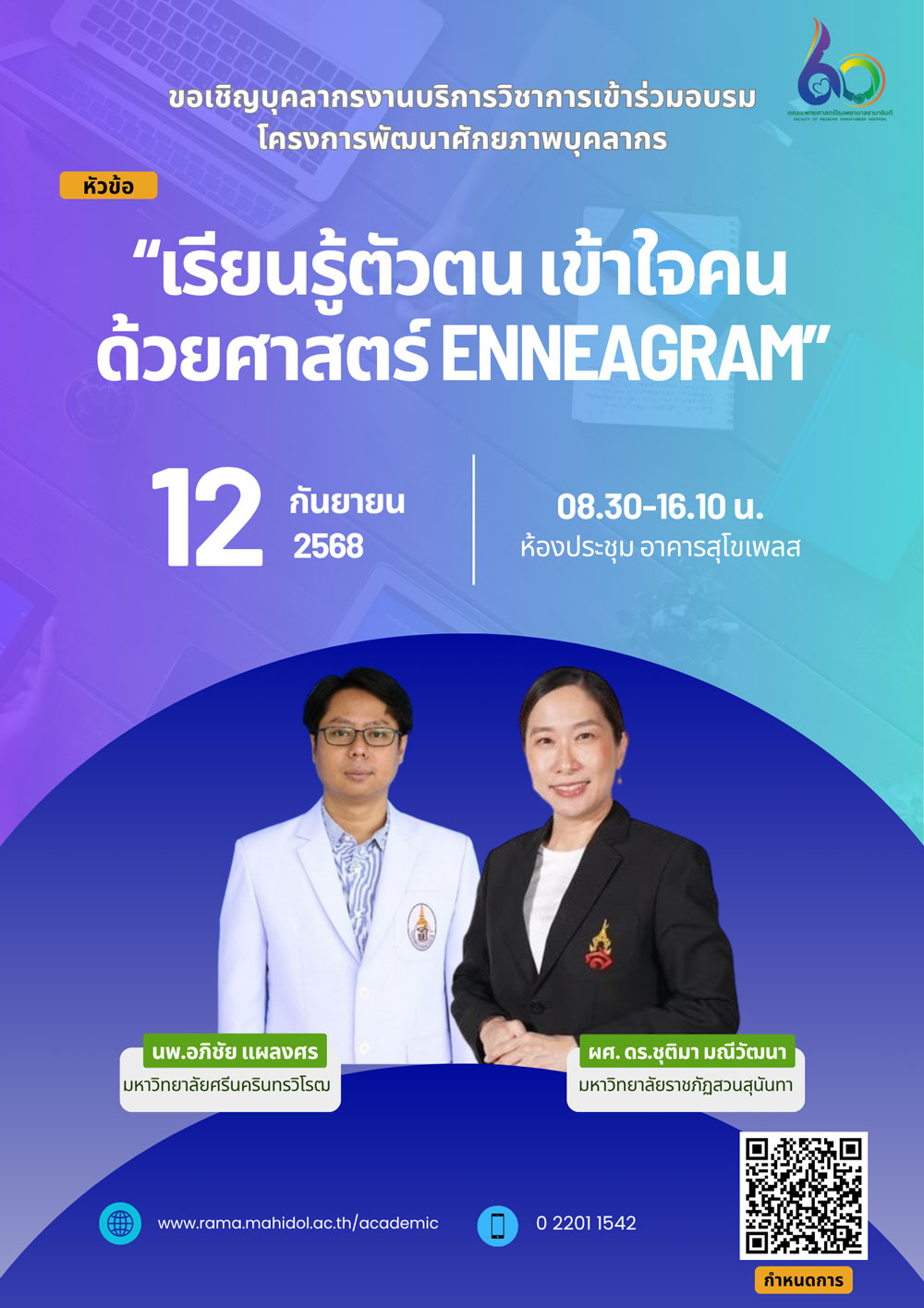 ขอเชิญบุคลากรงานบริการวิชาการเข้าร่วมอบรม โครงการพัฒนาศักยภาพบุคลากร หัวข้อ "เรียนรู้ตัวตน เข้าใจคนด้วยศาสตร์ ENNEAGRAM"