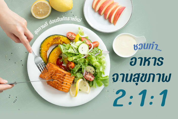 2 : 1 : 1 เป็นการกำหนดปริมาณอาหารที่เหมาะสม โดยการแบ่งสัดส่วนของจาน (เส้นผ่านศูนย์กลางขนาด 9 นิ้ว) ออกเป็น 4 ส่วนเท่า ๆ กัน และแบ่งประเภทอาหารดังนี้
