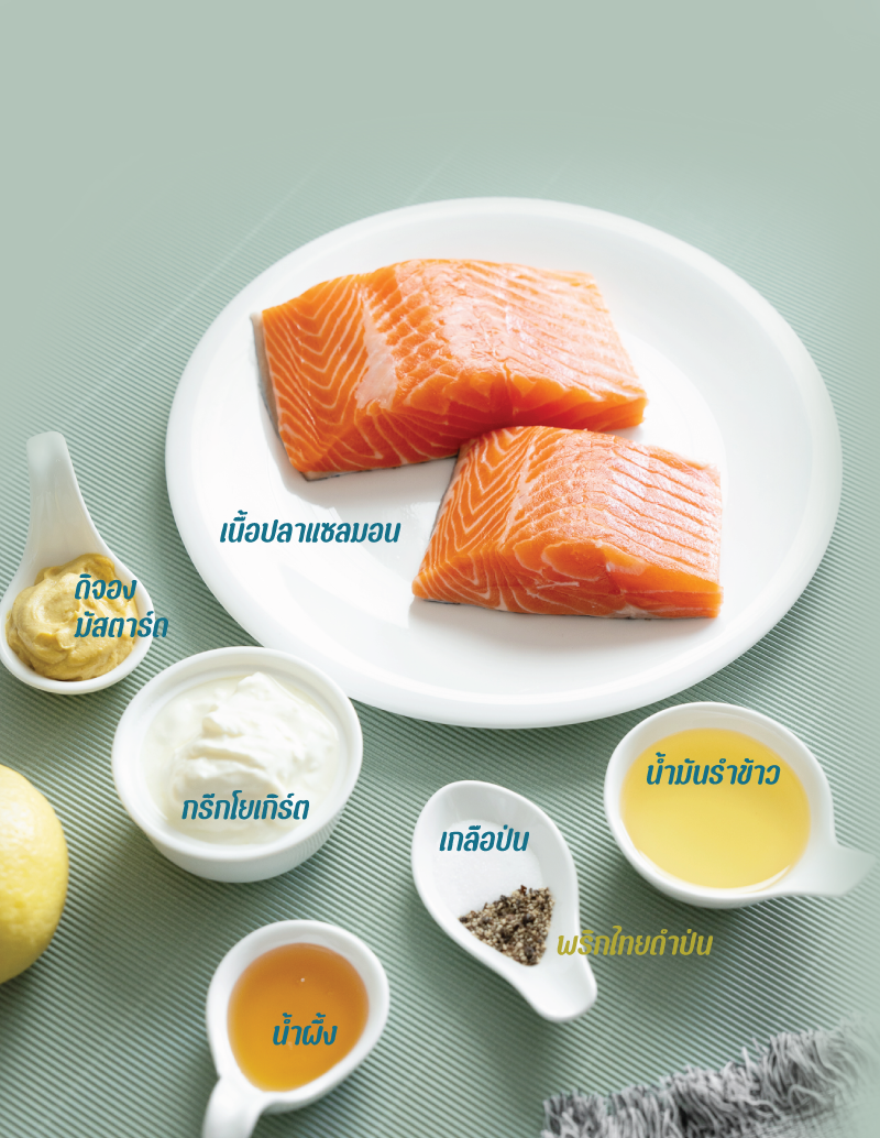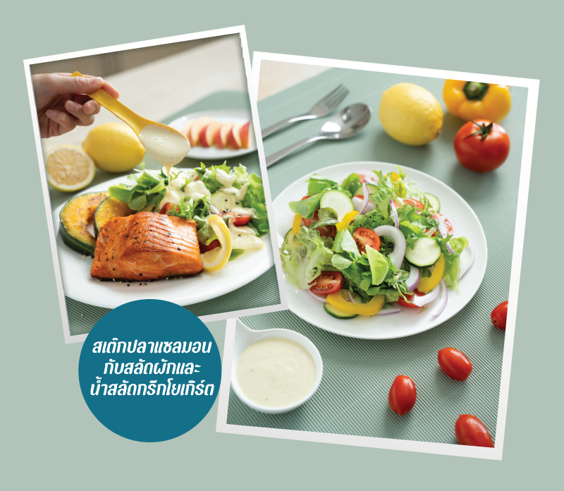 นิตยสาร @Rama ฉบันนี้ หลีขอชวนคุณผู้อ่านทุกท่านมาทำอาหารจานสุขภาพ 2 : 1 : 1 กับเมนู “สเต๊กปลาแซลมอนกับสลัดผักและน้ำสลัดกรีกโยเกิร์ต” ซึ่งเมนูจานนี้เป็นการนำเอาเนื้อปลาแซลมอนมาย่างให้สุกเหลืองกำลังดี เสิร์ฟมากับฟักทองญี่ปุ่นย่าง ผักสลัด และน้ำสลัดกรีกโยเกิร์ตโฮมเมด เป็นเมนูอาหารเพื่อสุขภาพฉบับพรีเมียม มาดูส่วนผสมและวิธีทำกันเลยค่ะ