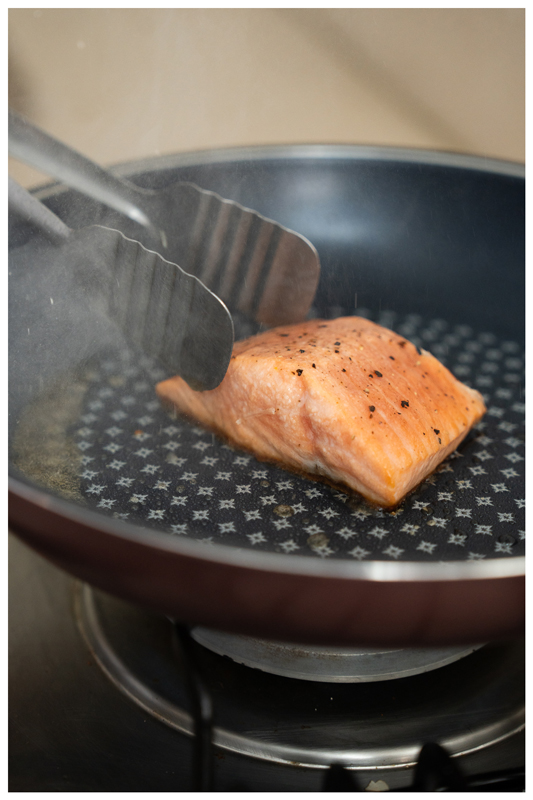 4. ล้างเนื้อปลาแซลมอน ใช้ทิชชูแผ่นหนาสำหรับใช้ในครัว ซับน้ำจากปลาให้แห้ง จากนั้นโรยเกลือและพริกไทยดำพอทั่ว