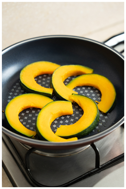 3. หั่นฟักทองญี่ปุ่นเป็นชิ้นบาง คว้านเมล็ดออก ล้างให้สะอาด นำฟักทองไปนึ่งหรือต้มให้พอสุก จากนั้นนำไปย่างในกระทะบนไฟกลาง โรยเกลือและพริกไทยดำเล็กน้อย ย่างจนฟักทองสุกนิ่ม และสีเหลืองสวย ปิดไฟ ตักขึ้นใส่จานเตรียมไว้