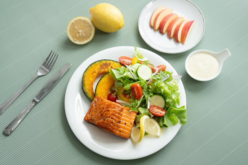 6. จัดจานเสิร์ฟ โดยแบ่งสัดส่วนของจานออกเป็น 4 ส่วนเท่า ๆ กัน ใส่ผักสลัด 2 ส่วน ฟักทองย่าง 1 ส่วน และสเต๊กปลาแซลมอน 1 ส่วน เสิร์ฟคู่กับน้ำสลัดกรีกโยเกิร์ต