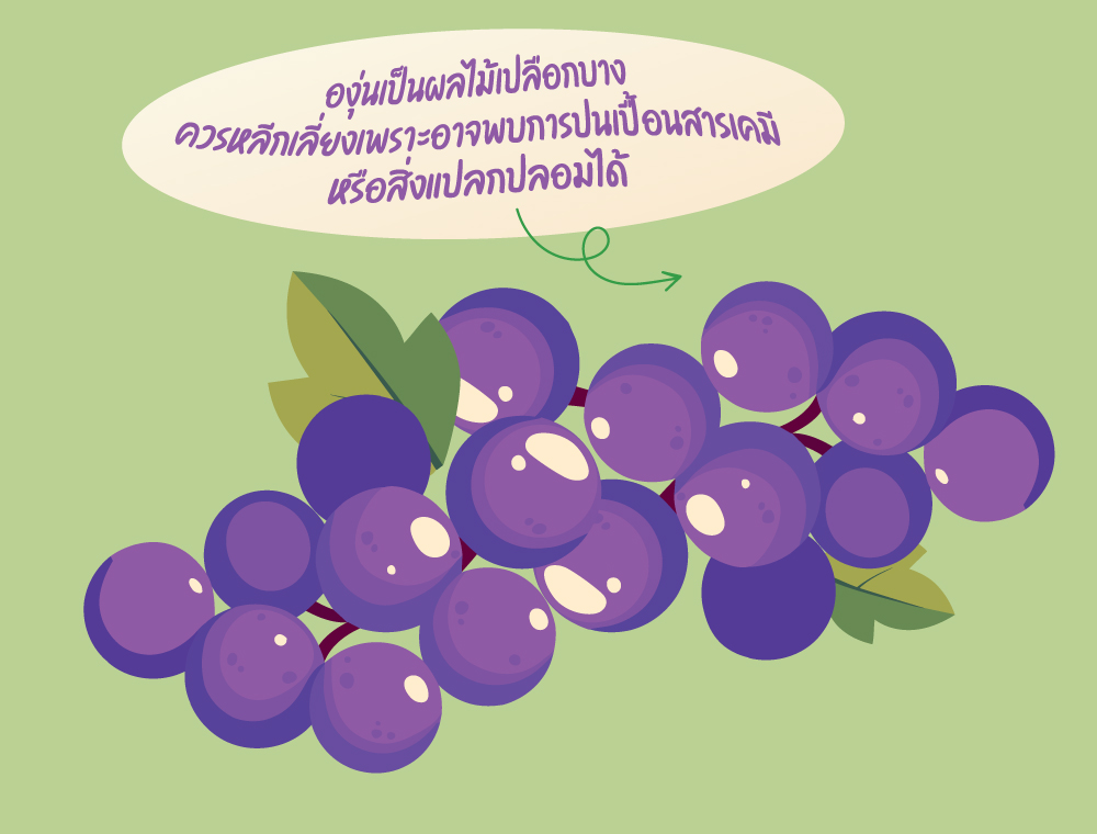 อาหารจำพวกผลไม้ สามารถรับประทานได้แต่ขอให้รับประทานผลไม้จำพวกที่มีเปลือก เช่น ส้ม แตงโม ควรหลีกเลี่ยงผลไม้ที่ต้องกินทั้งเปลือก หรือผลไม้เปลือกบาง เช่น องุ่น แอปเปิล เพราะอาจจะพบการปนเปื้อนสารเคมี หรือสิ่งแปลกปลอม