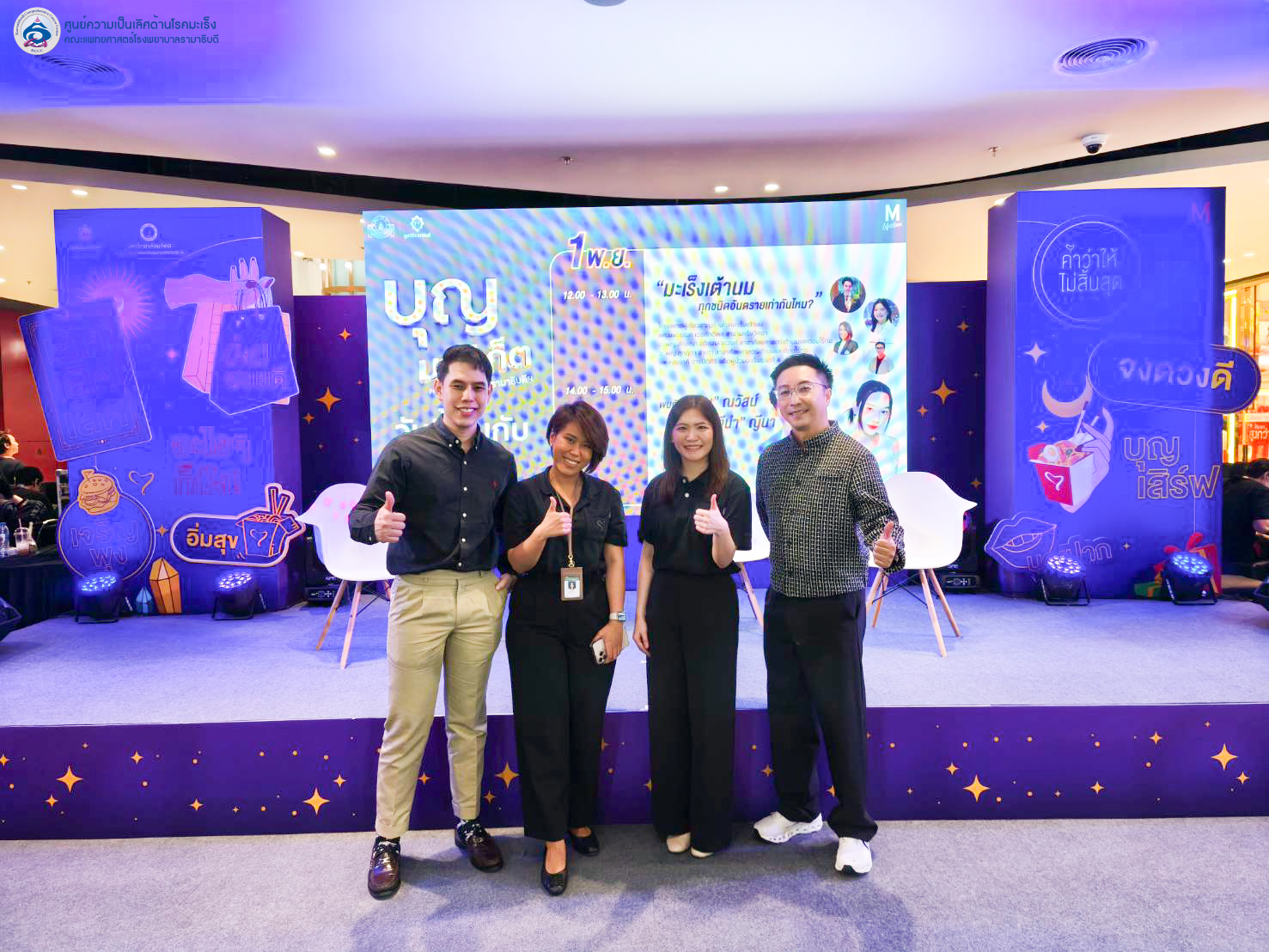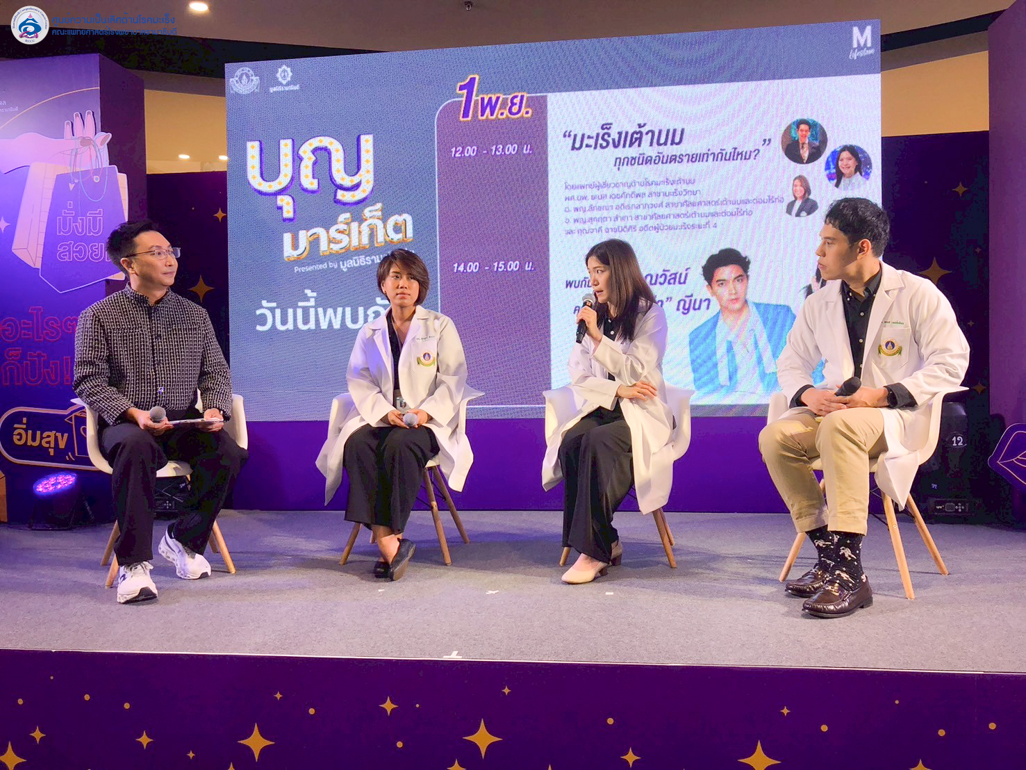 ในวันเสาร์ที่ 1 พฤศจิกายน 2568 ศูนย์ความเป็นเลิศด้านโรคมะเร็งคณะแพทยศาสตร์โรงพยาบาลรามาธิบดี มหาวิทยาลัยมหิดล ร่วมกิจกรรม ใน งาน“บุญมาร์เก็ต” งานแฟร์สายบุญ โดยเสวนา เรื่องเกี่ยวกับ มะเร็งเต้านม ในหัวข้อ "มะเร็งเต้านมทุกชนิด อันตรายเท่ากันไหม?" โดยเชิญแพทย์ผู้เชี่ยวชาญร่วมเสวนา 1.อ.พญ.ลักขณา อดิเรกลาภวงศ์ – สาขาศัลยศาสตร์เต้านมและต่อมไร้ท่อ 2.ผศ.นพ. ธเนศ เดชศักดิพล - สาขามะเร็งวิทยา ภาควิชาอายุรศาสตร์ 3.พญ.สุกฤตา สําเภา - ศัลยแพทย์ จักรีนฤบดินทร์ 4.คุณจาคี ฉายปิติศิริ อดีตผู้ป่วยมะเร็งระยะที่ 4