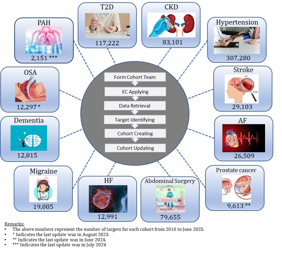 Data warehouses for non-communicable diseases (NCDs) from Ramathibodi hospital information system focusing on metabolic syndrome atherosclerosis, cancer and surgery including type 2 diabetes (T2D), hypertension (HT), pulmonary arterial hypertension (PAH), chronic kidney disease (CKD), cardiovascular disease (CVDs), atrial fibrillation (AF), stroke, prostate cancer, abdominal surgery, heart failure (HF), migraine, dementia, and obstructive sleep apnea (OSA) were constructed since 2010 and quaterly updated until now.