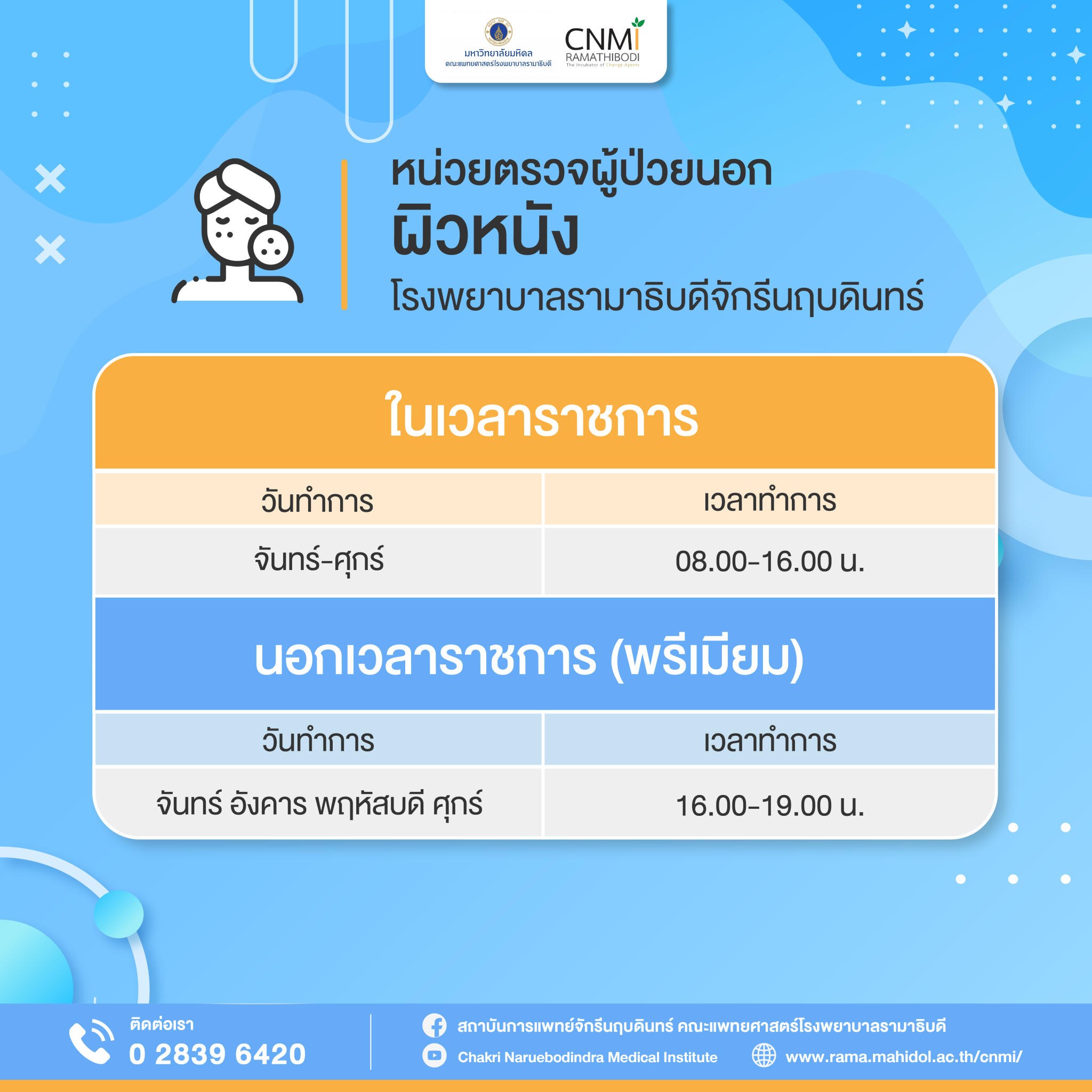 สอบถามรายละเอียดการเข้ารับบริการได้ที่ หน่วยตรวจผู้ป่วยนอก ผิวหนัง