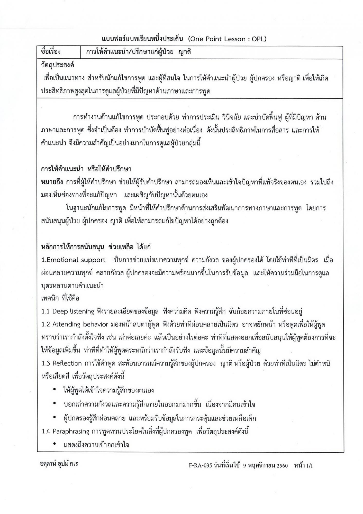 การให้คำแนะนำ/ปรึกษาแก่ผู้ป่วย ญาติ (OPL)