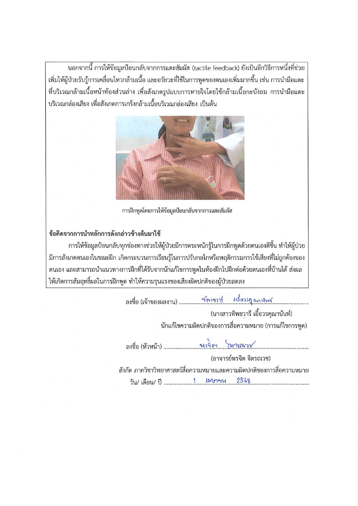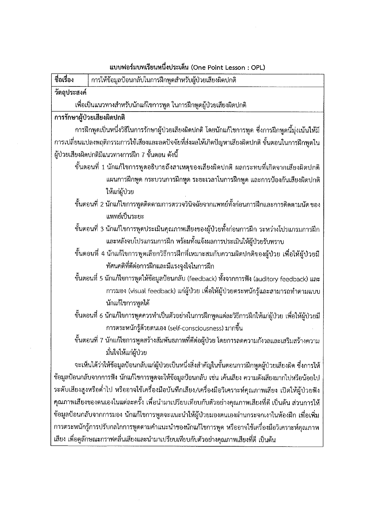 เสียงผิดปกติเป็นความผิดปกติที่ติดสามอันดับแรกของผู้ป่วยที่เข้ารับการรักษาที่คลินิกฝึกพูด ซึ่งหลักการในการฝึกพูดสำหรับผู้ป่วยเสียงผิดปกติมีหลากหลายแนวทาง ซึ่งการให้ข้อมูลย้อนกลับในการฝึกพูดเป็นหลักการหนึ่งที่ผู้ป่วยควรได้รับ