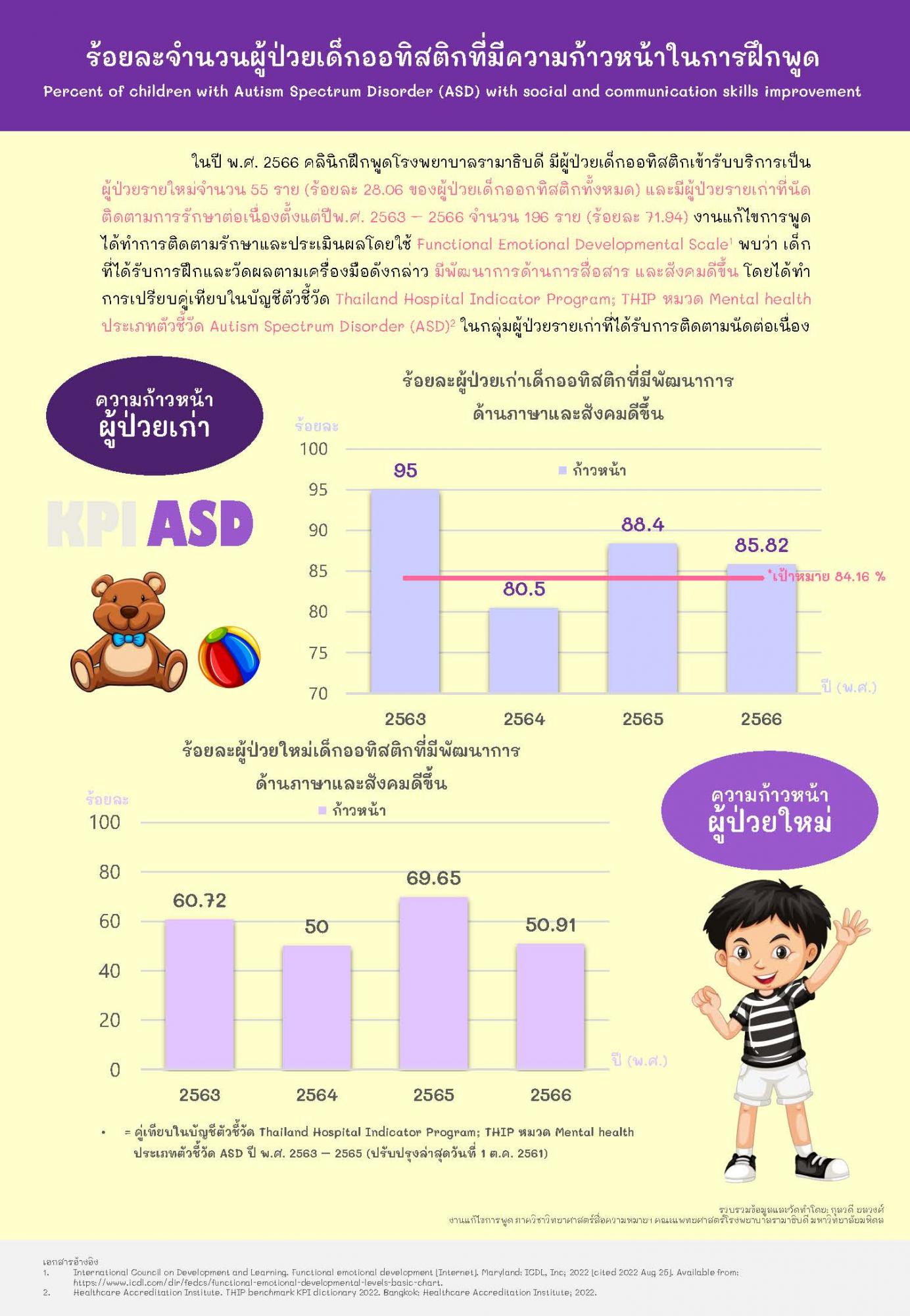 คลินิกฝึกพูดโรงพยาบาลรามาธิบดีให้บริการฝึกพูดในผู้ป่วยเด็กออทิสติก โดยร้อยละจำนวนผู้ป่วยเด็กออทิสติกที่มีความก้าวหน้าหลังจากฝึกพูด ดังนี้