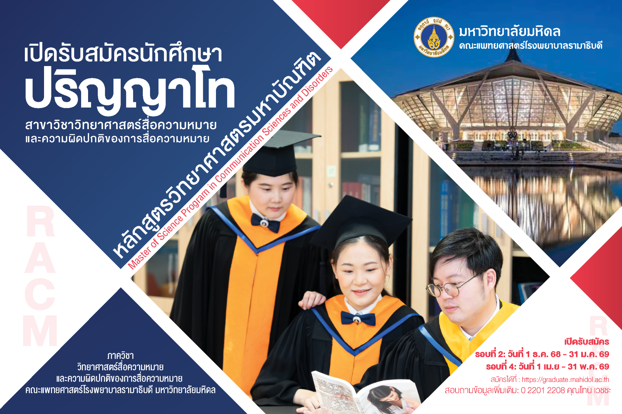 ระบบการรับสมัคร ติดต่องานรับนักศึกษา บัณฑิตวิทยาลัย มหาวิทยาลัยมหิดล 02 441 4125 ต่อ 112