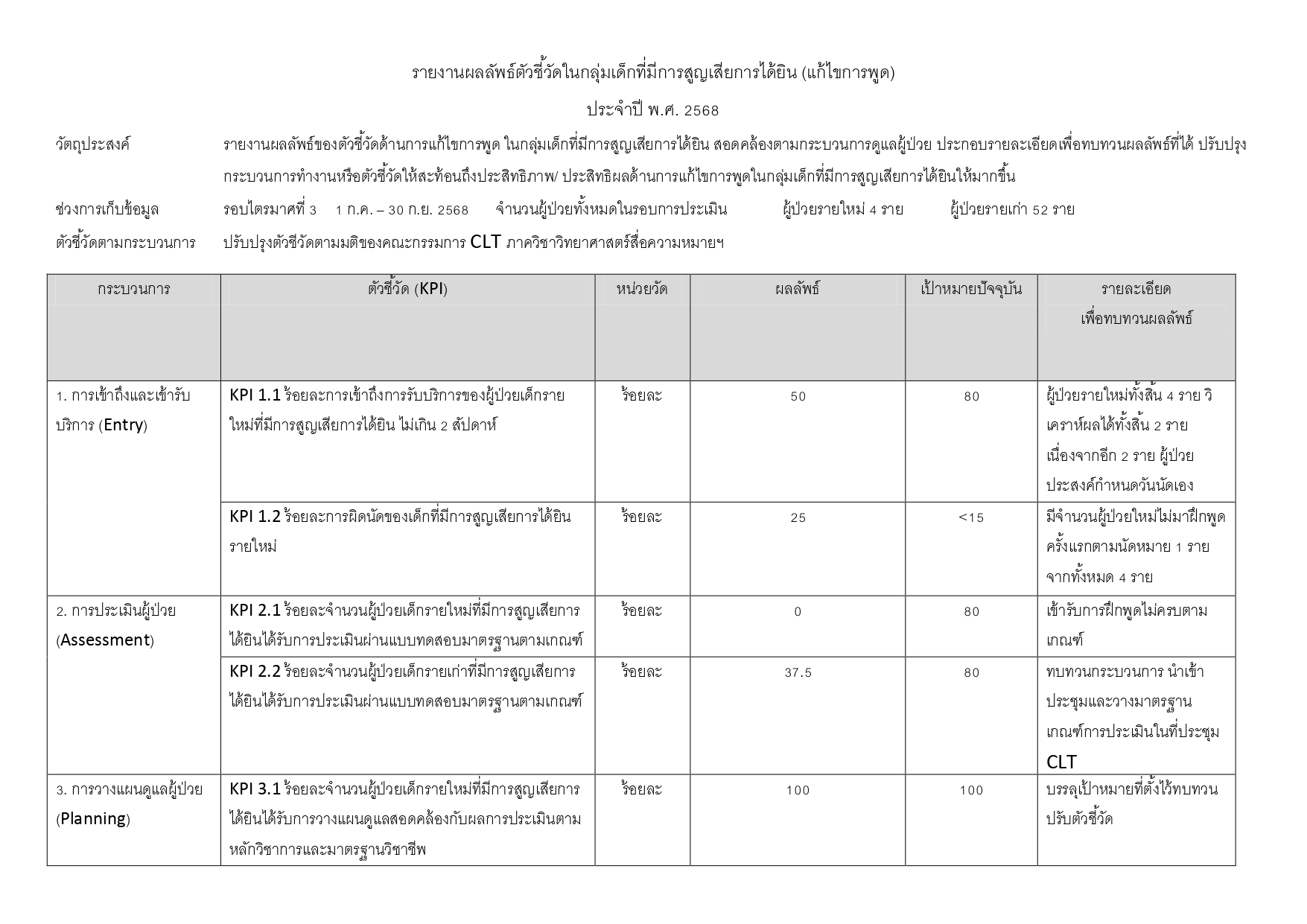 Clinical tracer กลุ่มผู้ป่วยเด็กที่มีการสูญเสียการได้ยิน และผลลัพธ์ตัวชี้วัดผลดำเนินการ ปี พ.ศ. 2568