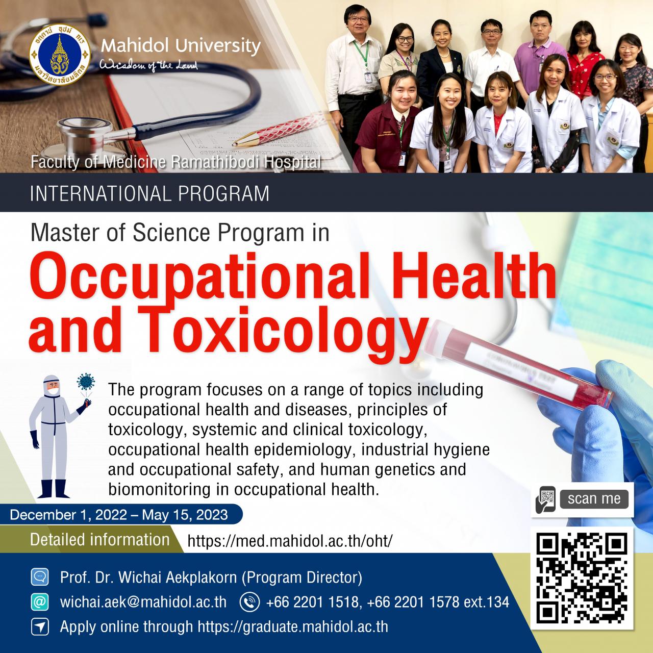 บัณฑิตวิทยาลัย มหาวิทยาลัยมหิดล เปิดรับสมัครผู้สนใจเข้าศึกษาในหลักสูตรวิทยาศาสตรมหาบัณฑิต สาขาวิชาอาชีวอนามัยและพิษวิทยา (หลักสูตรนานาชาติ) คณะแพทยศาสตร์โรงพยาบาลรามาธิบดี มหาวิทยาลัยมหิดล ตั้งแต่วันที่ 1 ธันวาคม 2565 ถึง 15 พฤษภาคม 2566