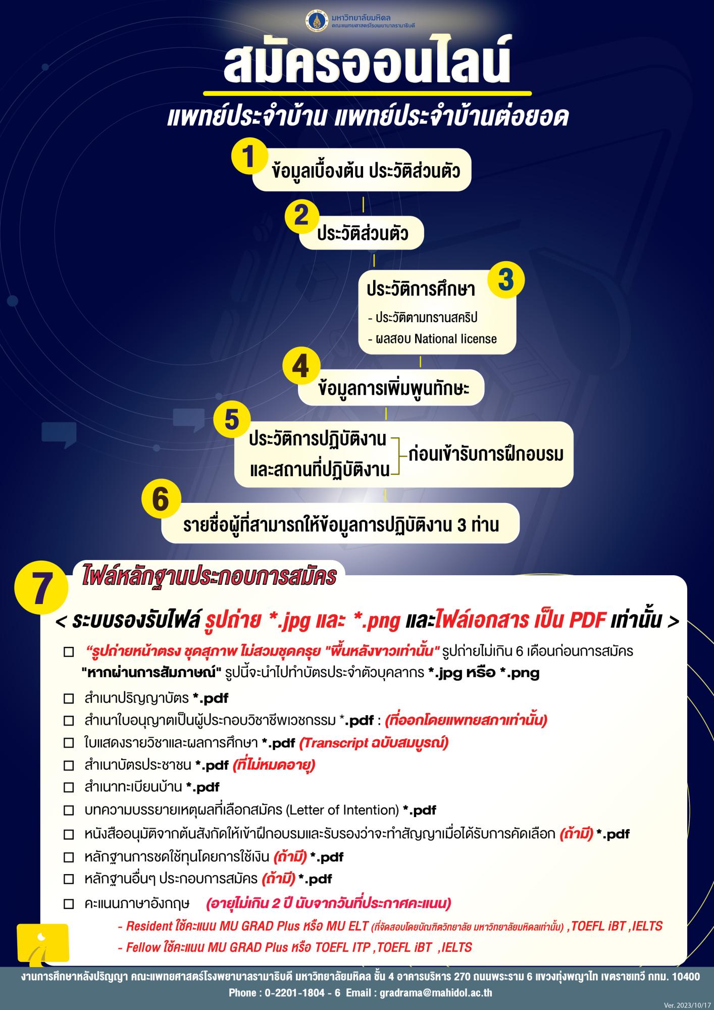 2. สมัครในระบบรับสมัครแพทย์ประจำบ้านต่อยอด ออนไลน์ ปีการฝึกอบรม 2569 งานการศึกษาหลังปริญญา คณะแพทยศาสตร์โรงพยาบาลรามาธิบดี มหาวิทยาลัยมหิดล สมัครและดูรายละเอียดการสมัครในเว็บไซต์ : https://www.rama.mahidol.ac.th/graded/raf/account/log_in (ระบบเปิดวันที่ 1-31ตุลาคม2569)