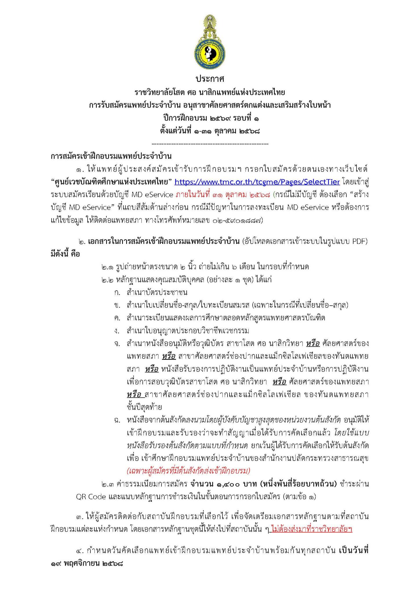 ประกาศ รับสมัครหลักสูตรแพทย์ประจำบ้านต่อยอด อนุสาขาศัลยศาสตร์ตกแต่งและเสริมสร้างใบหน้า ปีการฝึกอบรม 2569