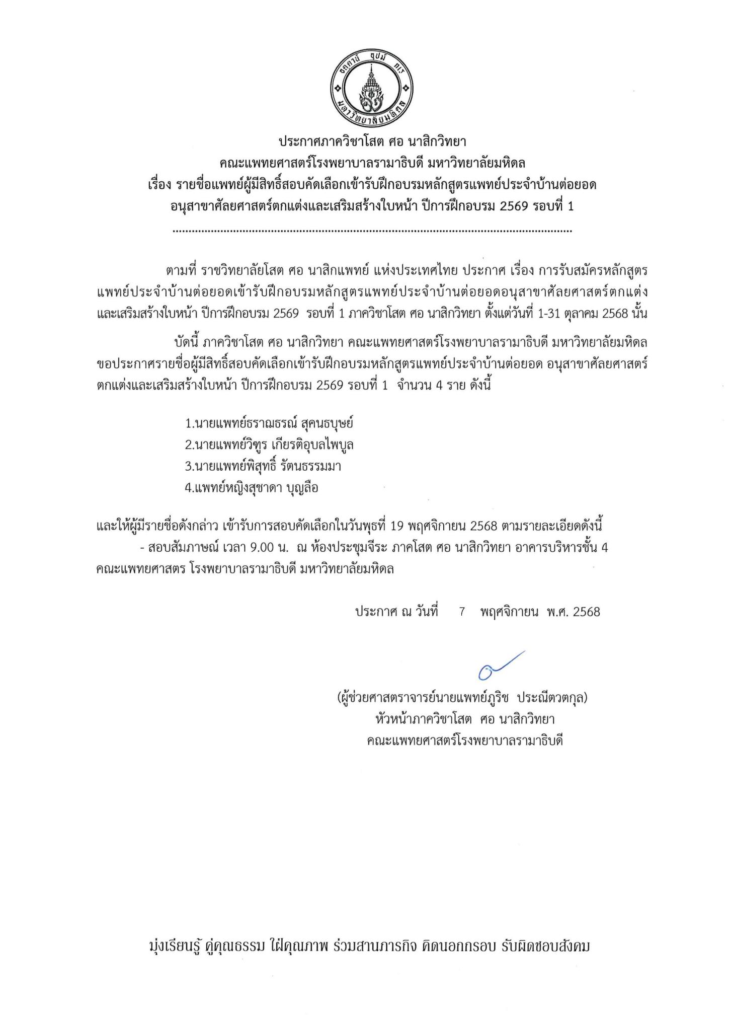 ประกาศรายชื่อแพทย์ผู้มีสิทธิ์สอบคัดเลือก เข้ารับฝึกอบรม