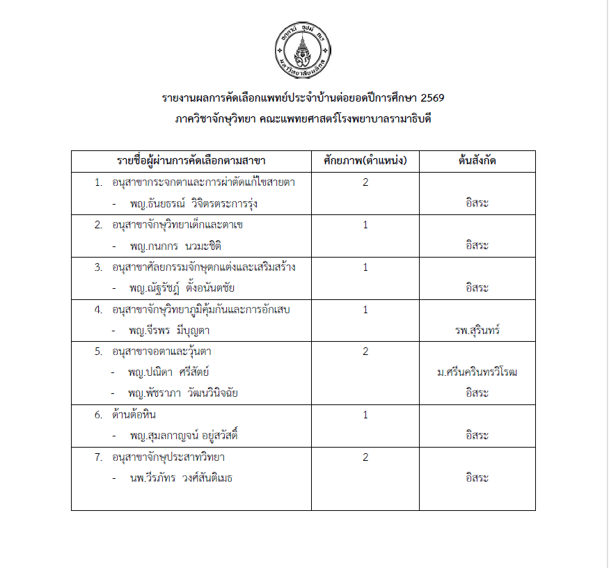 ภาควิชาจักษุวิทยา คณะแพทยศาสตรโรงพยาบาลรามาธิบดี เปิดรับสมัครแพทย์ประจำบ้านต่อยอด ปีการฝึกอบรม 2569