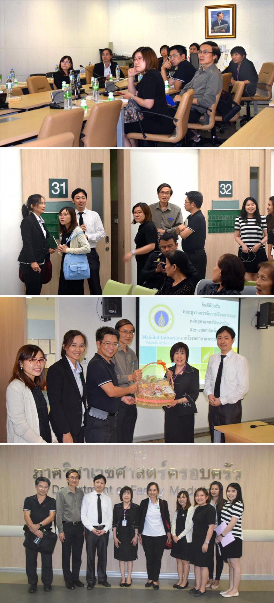 รศ.พญ.ปราณี พลังวชิรา หัวหน้าภาควิชาเวชศาสตร์ครอบครัว และอาจารย์ฝ่ายการศึกษาของภาควิชาฯ ต้อนรับคณะแพทย์จากโรงพยาบาลพระปกเกล้า นำโดย นพ.ชัชวาล สมพีร์วงศ์ รองผู้อำนวยการกลุ่มภารกิจด้านผลิตบุคลากรทางการแพทย์ ที่มาดูงานเพื่อแลกเปลี่ยนเรียนรู้การจัดการเรียนการสอนหลักสูตรแพทย์ประจำบ้านสาขาเวชศาสตร์ครอบครัว ณ ภาควิชาเวชศาสตร์ครอบครัว เมื่อวันที่ 8 พฤษภาคม 2560