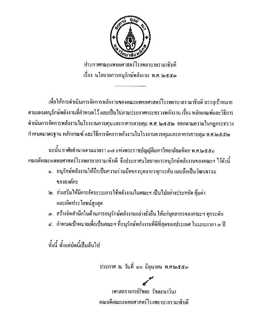 ฉะนั้น อาศัยอำนาจตามมาตรา ๓๗ แห่งพระราชบัญญัติมหาวิทยาลัยมหิดล ค.ศ. 2007 คณบดีคณะแพทยศาสตร์โรงพยาบาลรามาธิบดี จึงประกาศนโยบายการอนุรักษ์พลังงานของคณะฯ ไว้ดังนี้