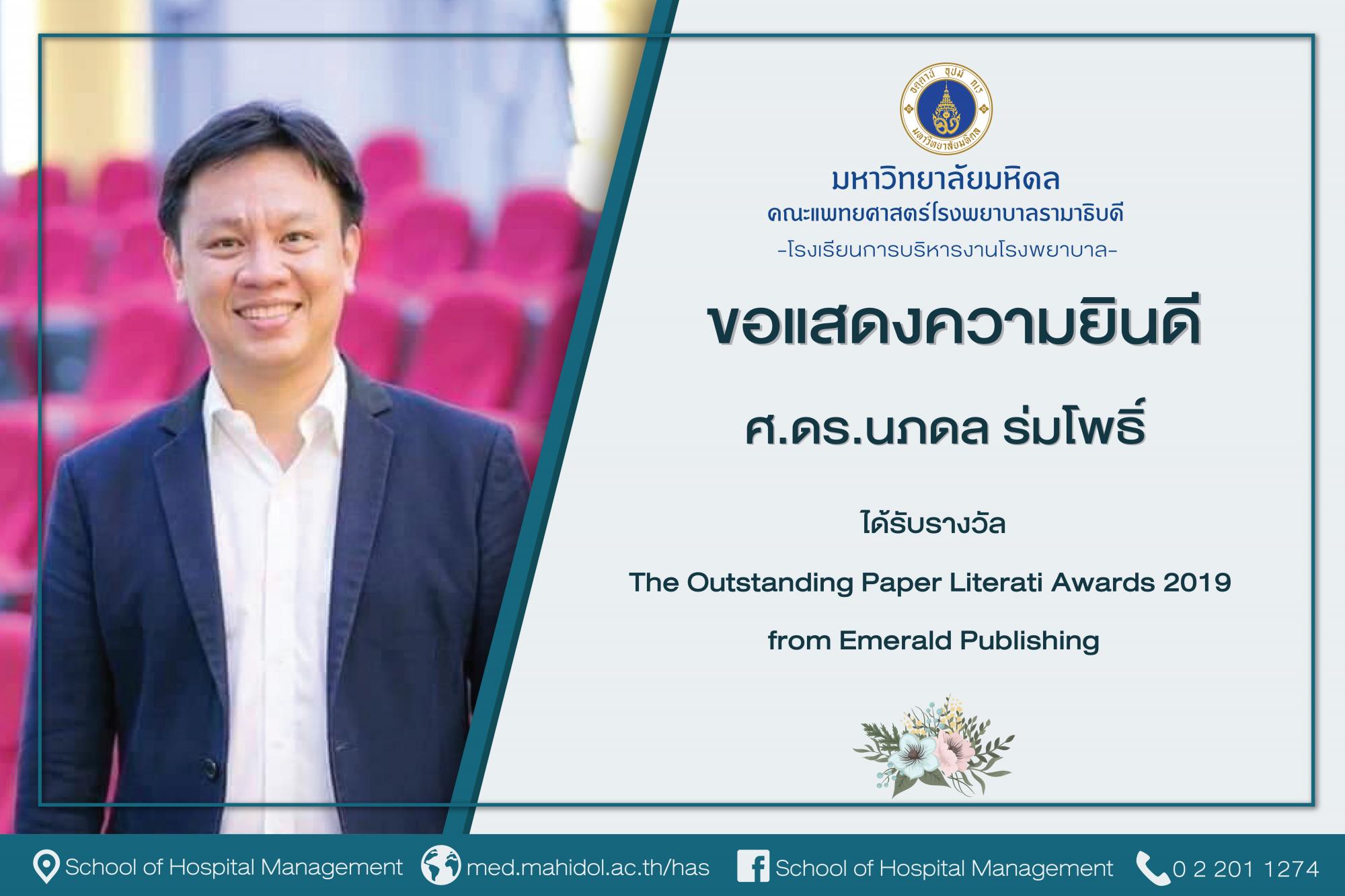 โรงเรียนการบริหารงานโรงพยาบาล คณะแพทยศาสตร์โรงพยาบาลรามาธิบดี มหาวิทยาลัยมหิดล ขอแสดงความยินดีกับ ศ.ดร.นภดล ร่มโพธิ์ วิทยากรประจำของโรงเรียนฯ ได้รับรางวัล The Outstanding Paper Literati Awards 2019 from Emerald Publishing
