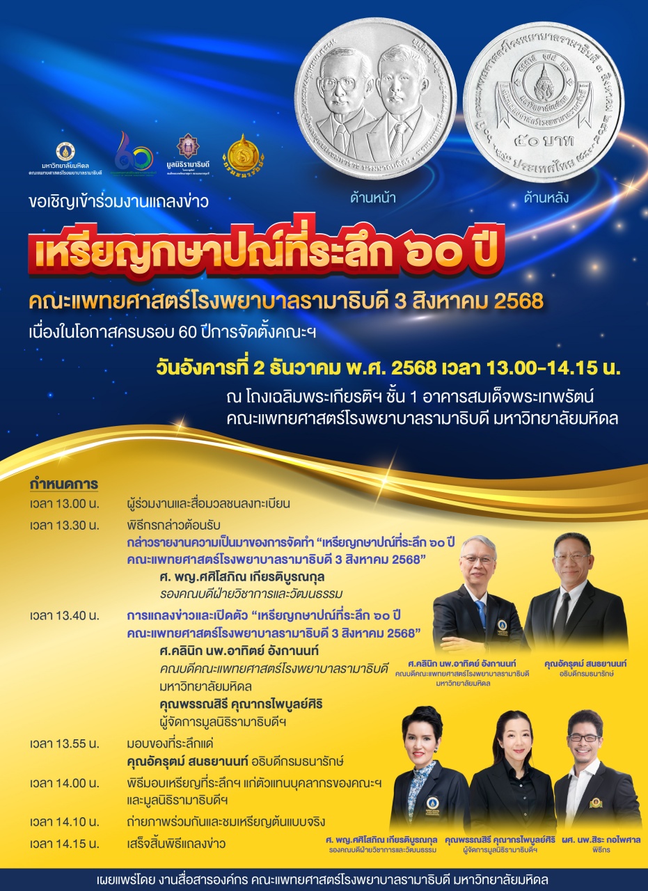 ขอเรียนเชิญร่วมงานแถลงข่าวและเปิดตัว “เหรียญกษาปณ์ที่ระลึก 60 ปี คณะแพทยศาสตร์โรงพยาบาลรามาธิบดี 3 สิงหาคม 2568”