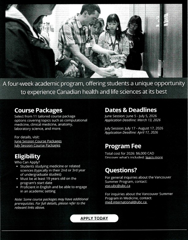 เปิดรับสมัคร Vancouver Summer Program in Medicine 2026