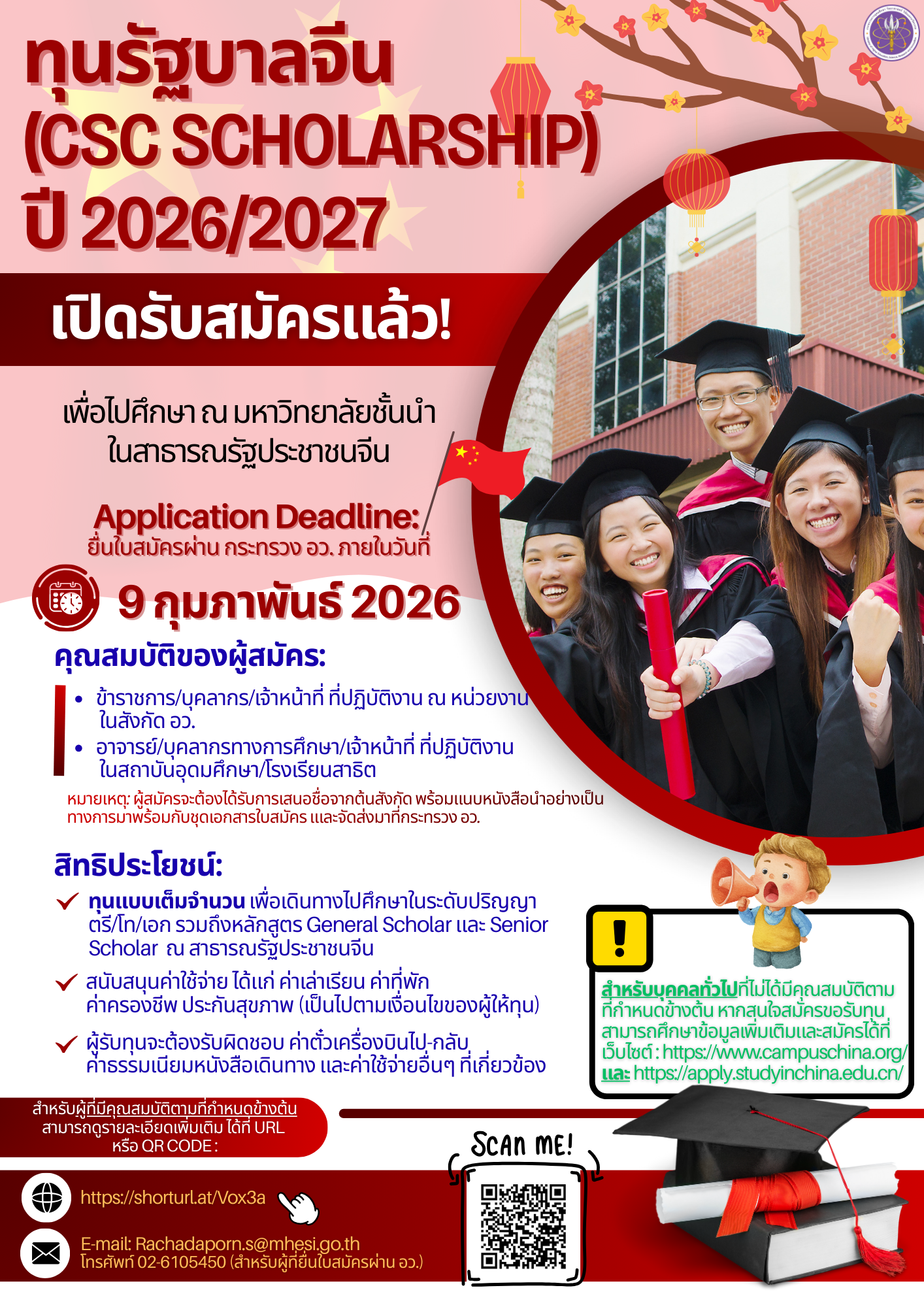 กระทรวงการอุดมศึกษา วิทยาศาสตร์ วิจัยและนวัตกรรม (อว.) ร่วมกับคณะกรรมการกำกับดูแลทุนการศึกษาการเรียนต่อต่างประเทศแห่งชาติจีน (CSC) ขอเชิญชวนข้าราชการ บุคลากร นักเรียน และนักศึกษาที่สนใจพัฒนาศักยภาพในระดับสากล สมัครรับ "ทุนรัฐบาลจีน (CSC Scholarship 2026/2027)" ภายใต้ความตกลงความร่วมมือด้านการศึกษาไทย-จีน