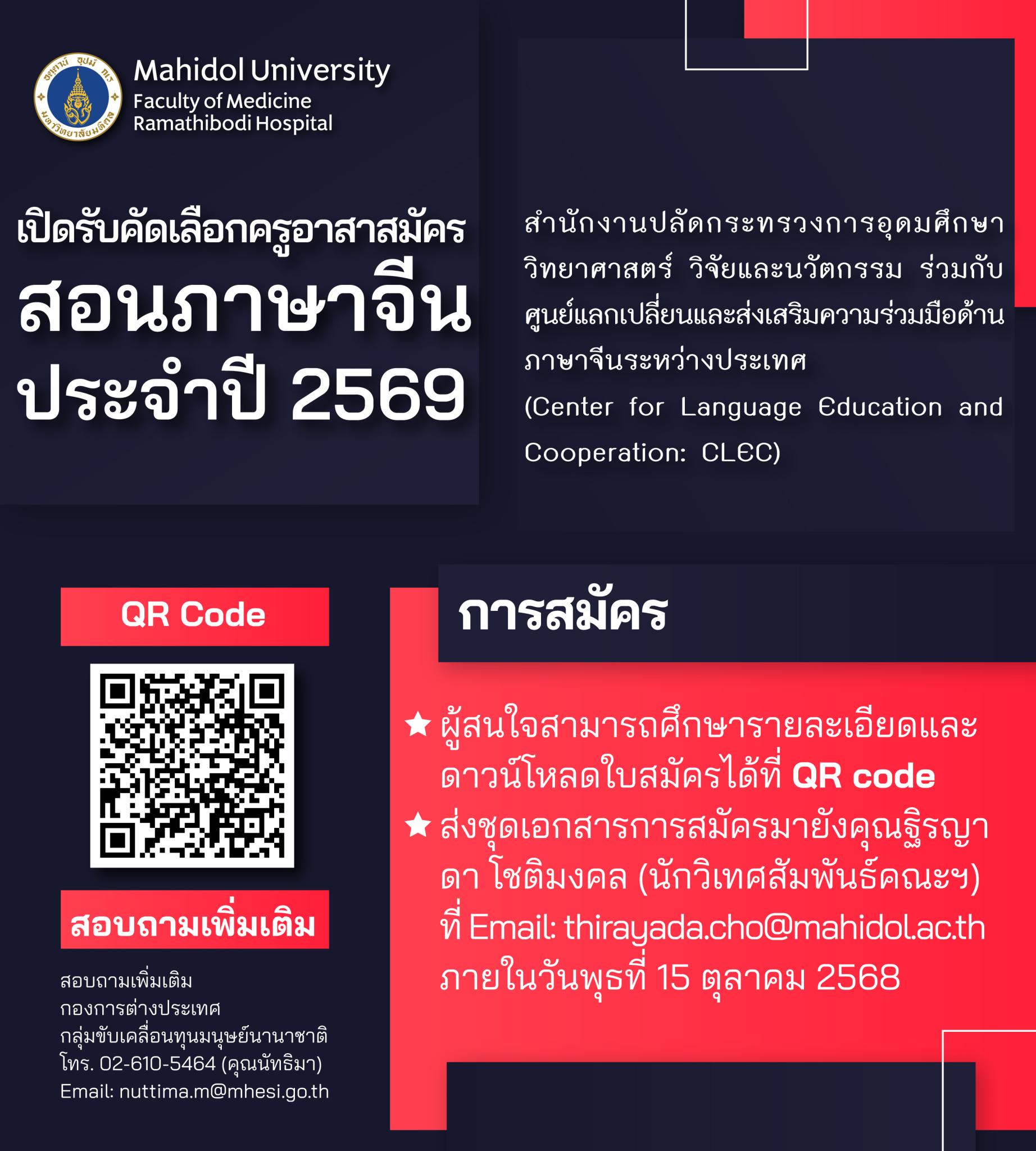 2. ส่งชุดเอกสารการสมัครมายังคุณฐิรญาดา โชติมงคล (นักวิเทศสัมพันธ์คณะฯ) ที่ Email: thirayada.cho@mahidol.ac.th ภายในวันพุธที่ 15 ตุลาคม 2568