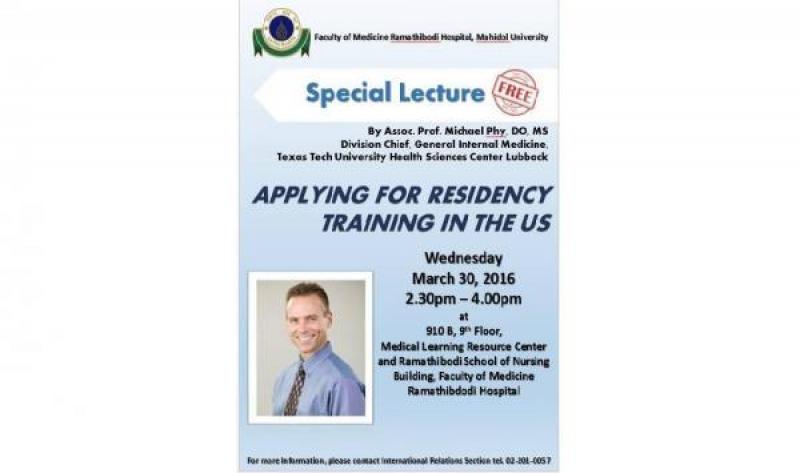 On 30 March 2016, 2.30 pm - 4.00 pm, Dr.Phy will kindly provide the special lecture to those who interest in residency training in USA at on 910B Meeting Room, Medical Learning Resource Center and Ramathibodi School of Nursing Building. Come to join and hear about his advice on it. Don't Miss!