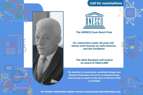 ยูเนสโกโดยการสนับสนุนจากรัฐบาลสาธารณรัฐโดมินิกัน มีความประสงค์จะมอบรางวัล UNESCO/Juan Bosch Prize ประจำปี ค.ศ. 2026 จำนวน 1 รางวัล มูลค่า 12,000 ดอลลาร์สหรัฐ แก่นักวิจัยรุ่นใหม่ เพื่อส่งเสริมและยกย่องผลงานวิจัยด้านสังคมศาสตร์ โดยเฉพาะผลงานที่เกี่ยวข้องกับนโยบายพัฒนาสังคมในภูมิภาคลาตินอเมริกาและแคริบเบียน