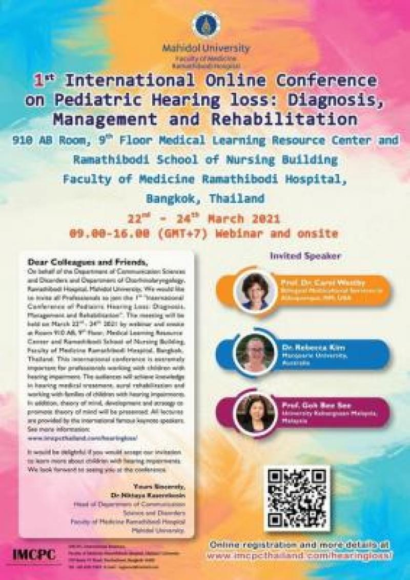 The meeting will be held on March 22nd - 24th, 2021 by webinar and onsite at Room 910 AB, 9th Floor, Medical Learning Resource Center and Ramathibodi School of Nursing Building, Faculty of Medicine Ramathibodi Hospital, Bangkok, Thailand. This international conference is extremely important for professionals working with children with hearing impairment. The audiences will achieve knowledge in hearing medical treatment, aural rehabilitation and working with families of children with hearing impairments. In addition, theory of mind, development and strategy to promote theory of mind will be presented. All lectures are provided by the international famous keynote speakers