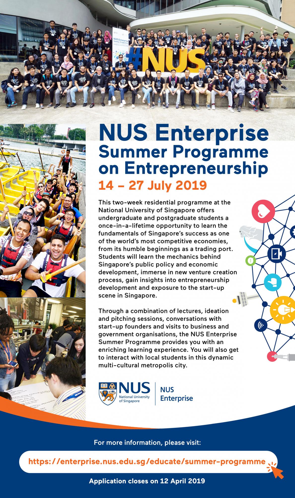 The 2019 NUS Enterprise Summer Programme on Entrepreneurship will be held from 14 - 27 July 2019.