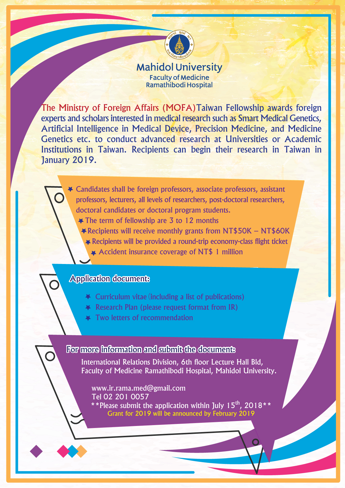 To apply the scholarship, please contact Ramathibodi's International Relations Section; tel:02-201-0057 Mr.Trithep or traithep.lub@mahidol.ac.th