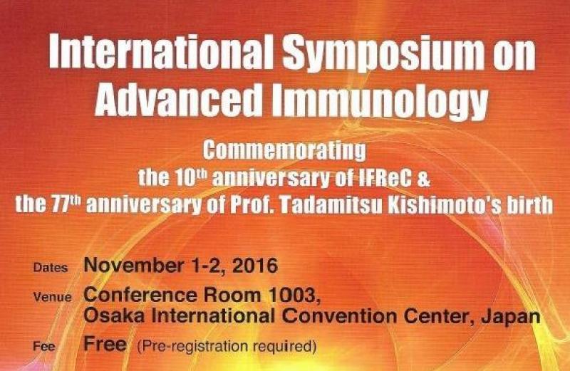 International Symposium on Advanced Immunology - Commemorating the 10th anniversary of IFReC and the 77th anniversary of Prof. Tadamitsu Kishimoto's birth - will be held on November 1-2, 2016.
