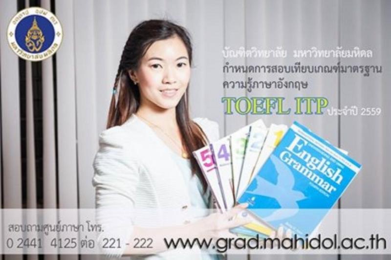 บัณฑิตวิทยาลัย เปิดสอบเทียบเกณฑ์มาตรฐานความรู้ภาษาอังกฤษ TOEFL ITP สำหรับนักศึกษาระดับบัณฑิตศึกษา มหาวิทยาลัยมหิดล รวมทั้งบุคคลทั่วไปที่สนใจศึกษาต่อและประสงค์จะสอบเทียบเกณฑ์มาตรฐานความรู้ภาษาอังกฤษ ตามเกณฑ์มาตรฐานของบัณฑิตวิทยาลัย มหาวิทยาลัยมหิดล ประจำปีการศึกษา 2559