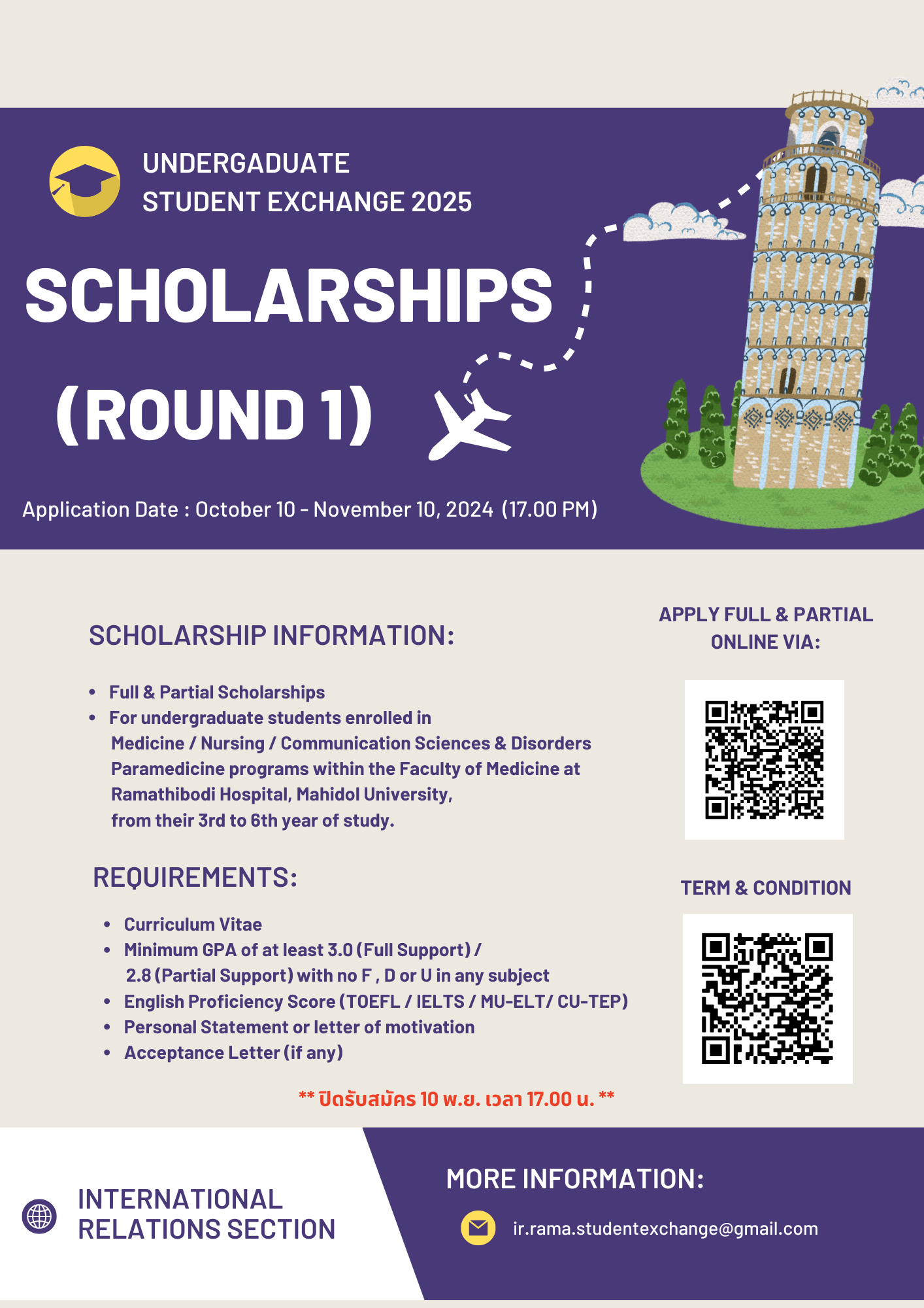 *Please note that this opportunity is only for Ramathibodi's undergraduate students in Medicine, CSD, Paramedic and Nursing