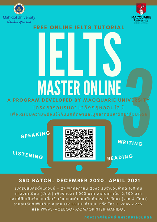 ขอเชิญนักศึกษาและบุคลากรเข้าร่วมอบรมในบทเรียนออนไลน์ IELTS Master เพื่อพัฒนาทักษะการใช้ภาษาอังกฤษเชิงวิชาการ ทั้ง ฟัง พูด อ่าน เขียน และเตรียมความพร้อมก่อนสอบ IELTS เพื่อนำผลคะแนนไปยื่นศึกษาต่อมหาวิทยาลัยในต่างประเทศ เข้าร่วมโครงการแลกเปลี่ยน เข้าทำงานในสถาบันชั้นนำทั้งในและต่างประเทศ หรือพัฒนาองค์กรให้มีประสิทธิภาพมากขึ้น
