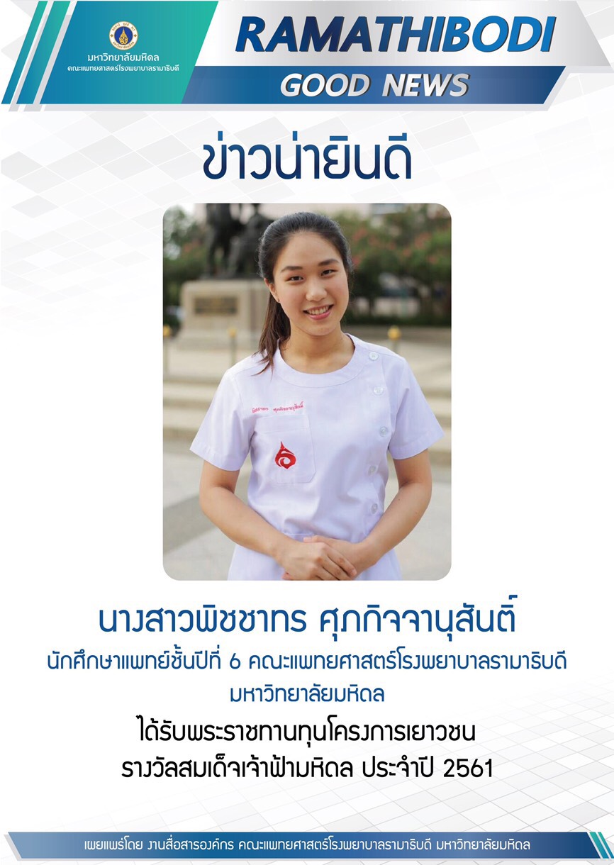 Congratulations to Ms.Pitchathorn Suppakijjanusan, our 6th year medical student, who received the royal scholarship on Prince Mahidol Award Youth Program 2018 !