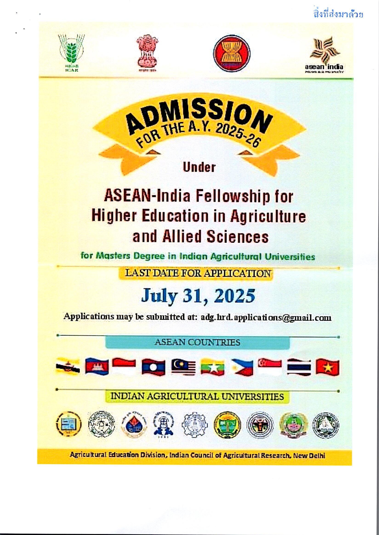 ขอเชิญบุคลากรและนักศึกษาผู้สนใจสมัครทุนการศึกษา ASEAN – India Fellowship for Higher Education in Agriculture and Allied Sciences ประจำปีการศึกษา 2568 – 2569 จากรัฐบาลอินเดีย เพื่อศึกษาต่อในระดับปริญญาโทที่ประเทศอินเดีย จำนวน 10 ทุน