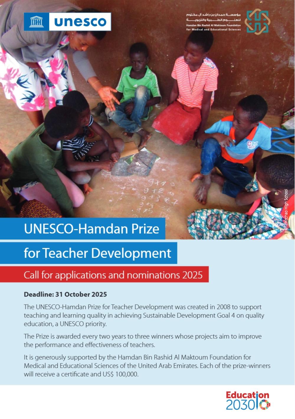 องค์การยูเนสโก (UNESCO) โดยการสนับสนุนจาก Hamdan bin Rashid Al Maktoum Foundation for Distinguished Academic Performance ประเทศสหรัฐอาหรับเอมิเรตส์ เปิดรับการเสนอชื่อเข้าชิง รางวัล UNESCO-Hamad Prize for Teacher Development ประจำปี 2025–2026