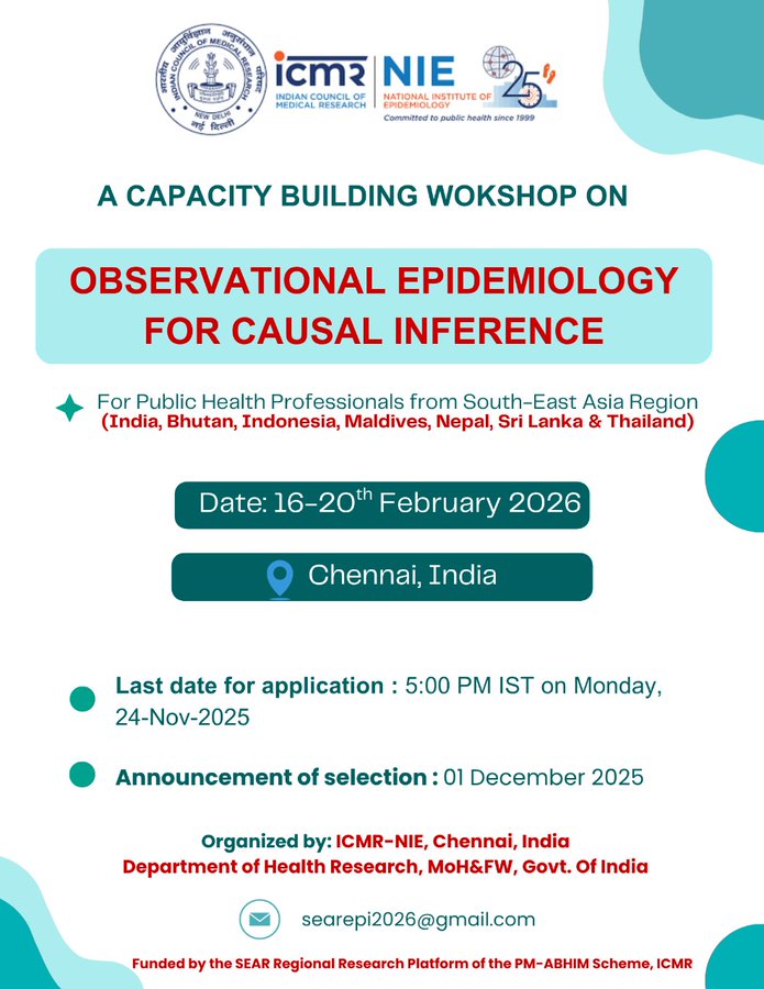 สถาบันระบาดวิทยาแห่งชาติ (ICMR-NIE) ภายใต้สภาวิจัยทางการแพทย์ของอินเดีย ขอเชิญบุคลากรสาธารณสุขระดับกลางสมัครเข้าร่วม เวิร์กชอป Observational Epidemiology for Causal Inference สำหรับประเทศในภูมิภาค WHO-SEAR