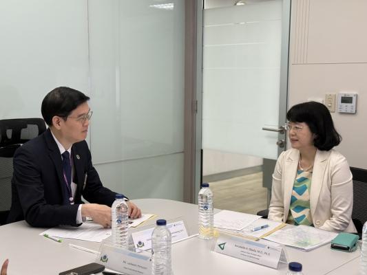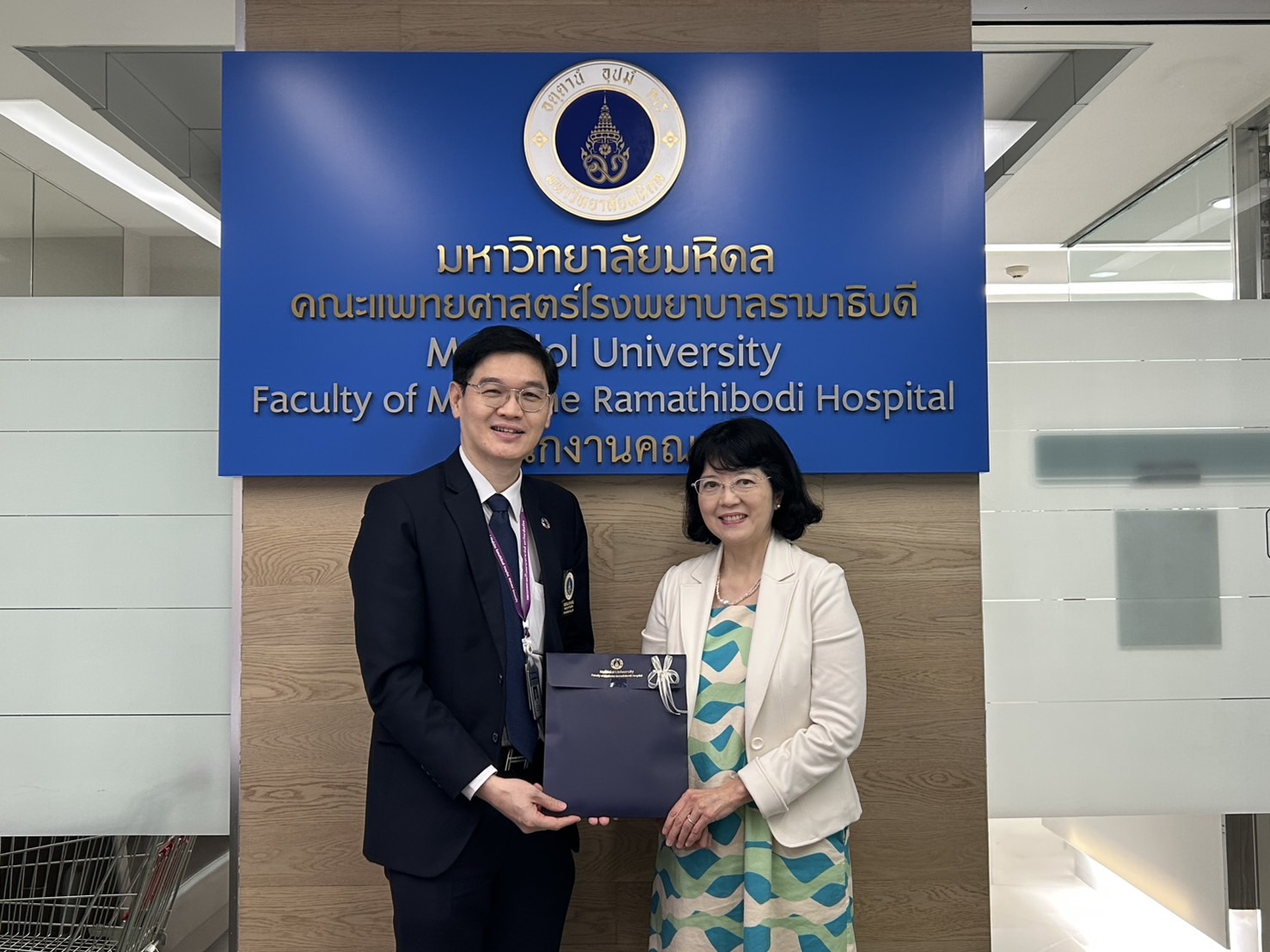On Friday, 14 November 2025, the Faculty of Medicine Ramathibodi Hospital, Mahidol University, welcomed a delegation from Kyorin University School of Medicine at Meeting Room 2, 6th Floor, Administrative Building Office. Assistant Professor Suchin Worawichawong, M.D., Deputy Dean for International Relations, together, and Ms. Ladawan Himsoon, Head of International Relations, extended a warm welcome to Professor Annabelle A. Okada, M.D., Ph.D., Assistant Dean of Global Affairs and Professor of Ophthalmology, representing Kyorin University.
