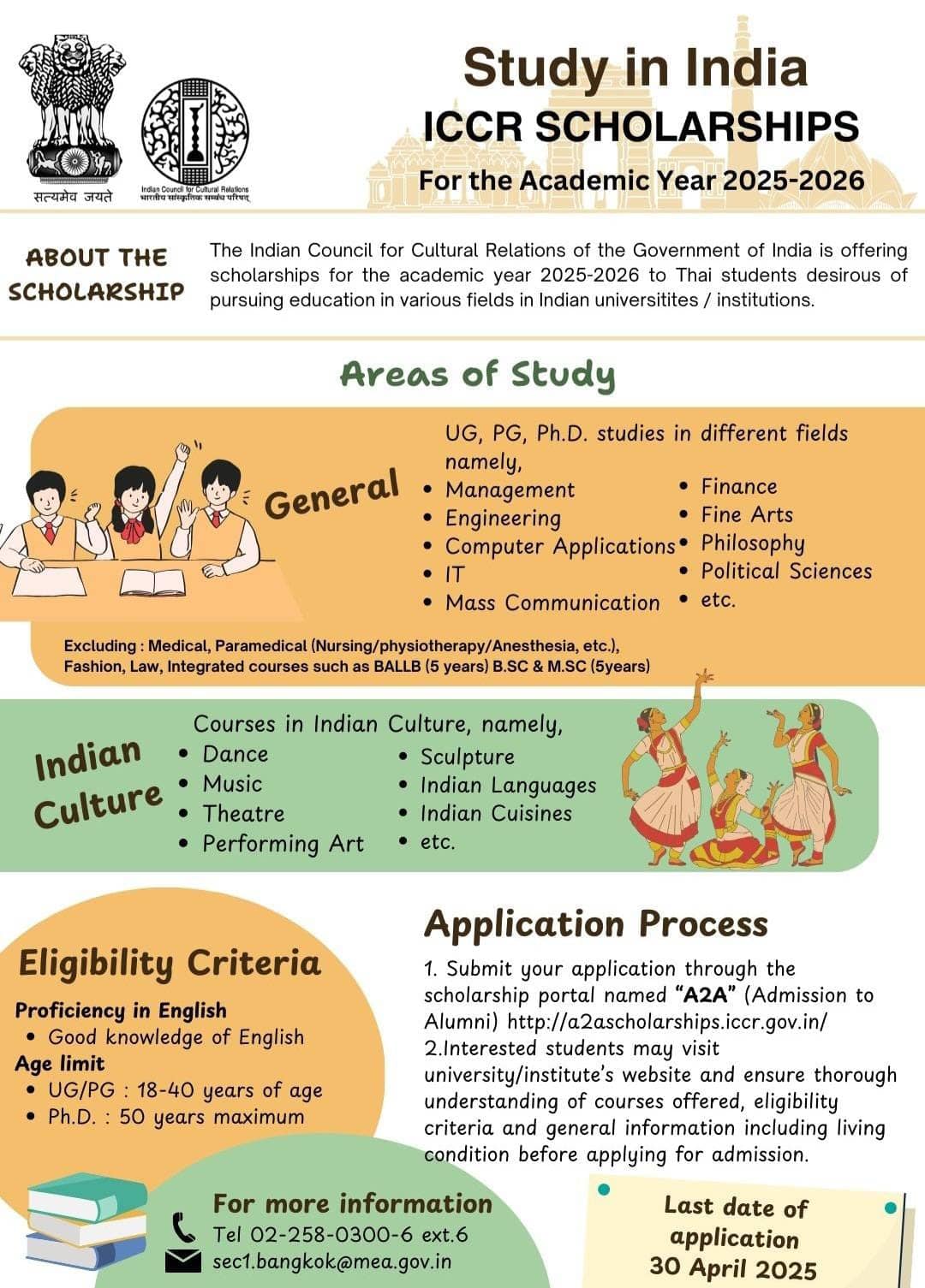ด้วยสถานเอกอัครราชทูตอินเดียประจำประเทศไทย ประชาสัมพันธ์ทุนการศึกษาของรัฐบาลอินเดีย ประจำปีการศึกษา 2025-2026 ซึ่งมอบแก่นักเรียนและนักศึกษาชาวต่างชาติไปศึกษาต่อในสถาบันอุดมศึกษาในประเทศอินเดีย ครอบคลุมปริญญาตรี ปริญญาโทและปริญญาเอกในหลากหลายสาขาวิชา เช่น บริหารธุรกิจ วิศวกรรมศาสตร์ คอมพิวเตอร์ เทคโนโลยีสารสนเทศ สื่อสารมวลชน การเงิน ศิลปกรรม ปรัชญา รัฐศาสตร์ เป็นต้น โดยผู้สมัครต้องมีคุณสมบัติเบื้องต้น ดังนี้