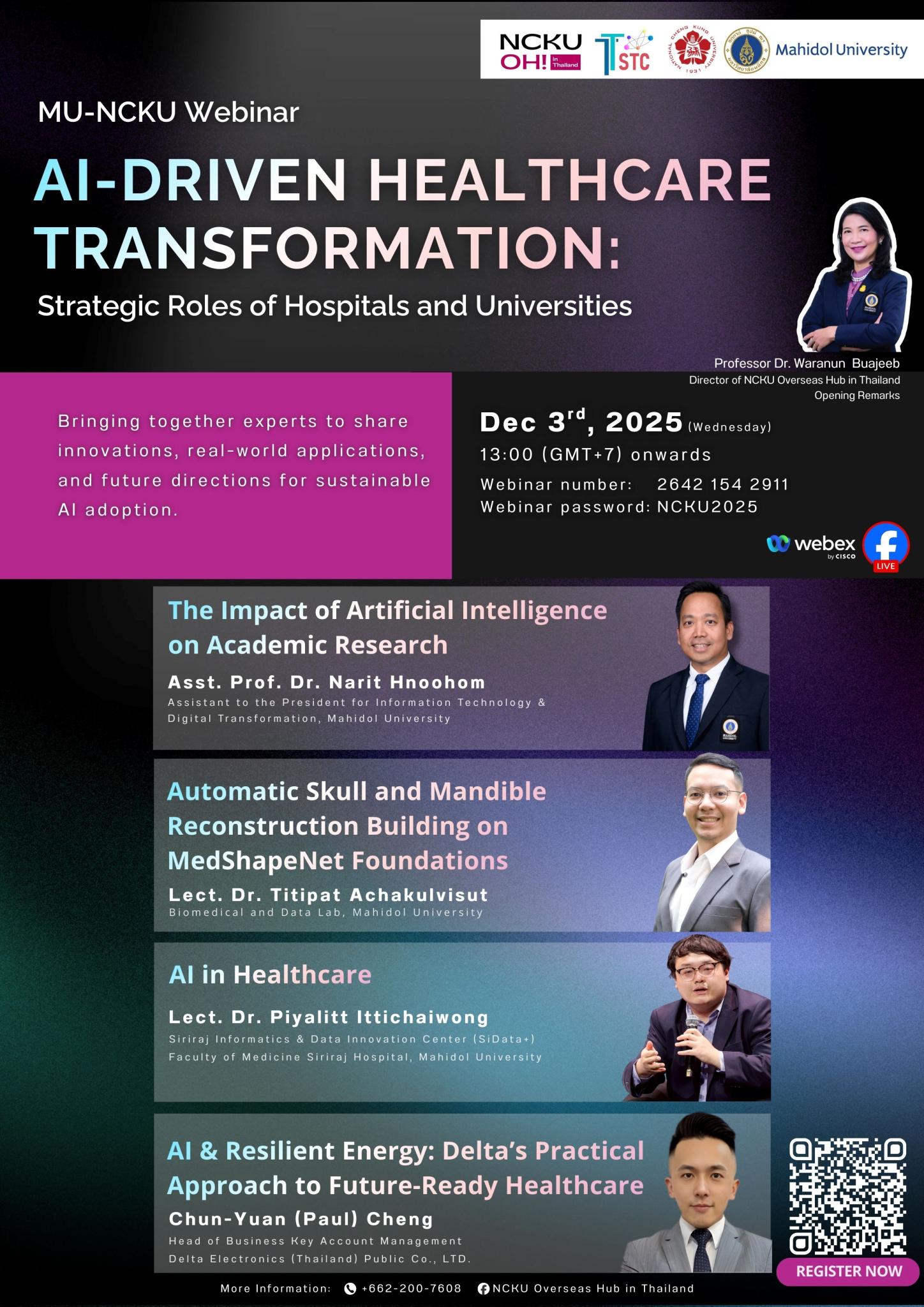 ๐ข เธเธญเนเธเธดเธเนเธเนเธฒเธฃเนเธงเธก MUโNCKU Webinar 2025: AI-Driven Healthcare Transformation: Strategic Roles of Hospitals and Universities