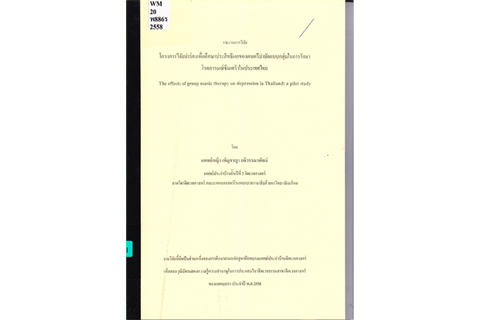 Title รายงานการวิจัย โครงการวิจัยนำร่องเพื่อศึกษาประสิทธิผลของดนตรีบำบัดแบบกลุ่มในการรักษาโรคซึมเศร้าในประเทศไทย = The effects of group music therapy on depression in Thailand : a pilot study Author เพ็ญชาดา อติวรรณาพัฒน์ Call Number WM20 พ886ร 2558 Contents