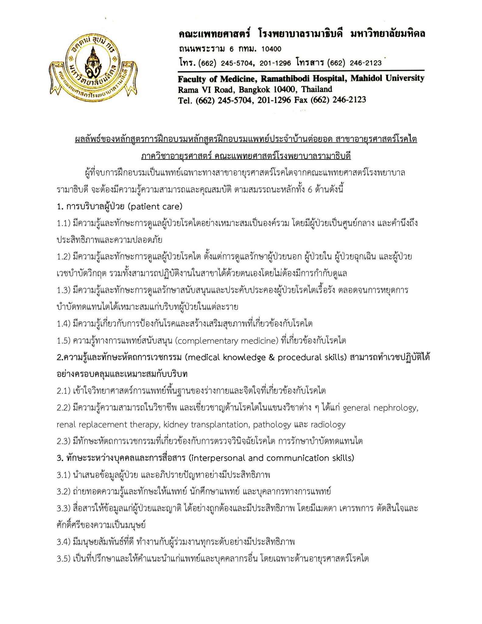 ผลลัพธ์ของหลักสูตรการฝึกอบรมหลักสูตรฝึกอบรมแพทย์ประจำบ้านต่อยอด สาขาอายุรศาสตร์โรคไต คณะแพทยศาสตร์โรงพยาบาลรามาธิบดี