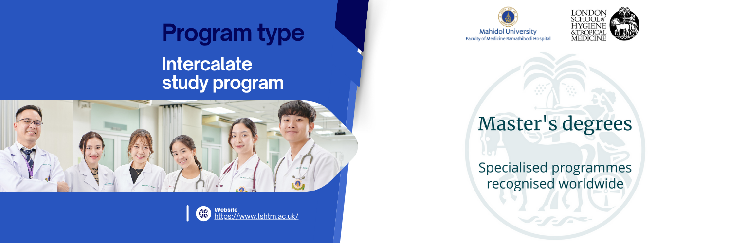 เป็นโครงการร่วม สำหรับหลักสูตรแพทยศาสตรบัณฑิค คณะแพทยศาสตร์โรงพยาบาลรามาธิบดี และหลักสูตรวิทยาศาสตรมหาบัณฑิต (Master of Science Public Health or Control of Infectious Diseases and Epidemiology or Climate Change & Planetary Health) หรือสาขาอื่น ๆ ตามที่คณะฯ กำหนด โดย London School of Hygiene and Tropical Medicine, University of London, สหราชอาณาจักร จำนวนนักศึกษาที่รับในแต่ละปี 1 – 20 คน