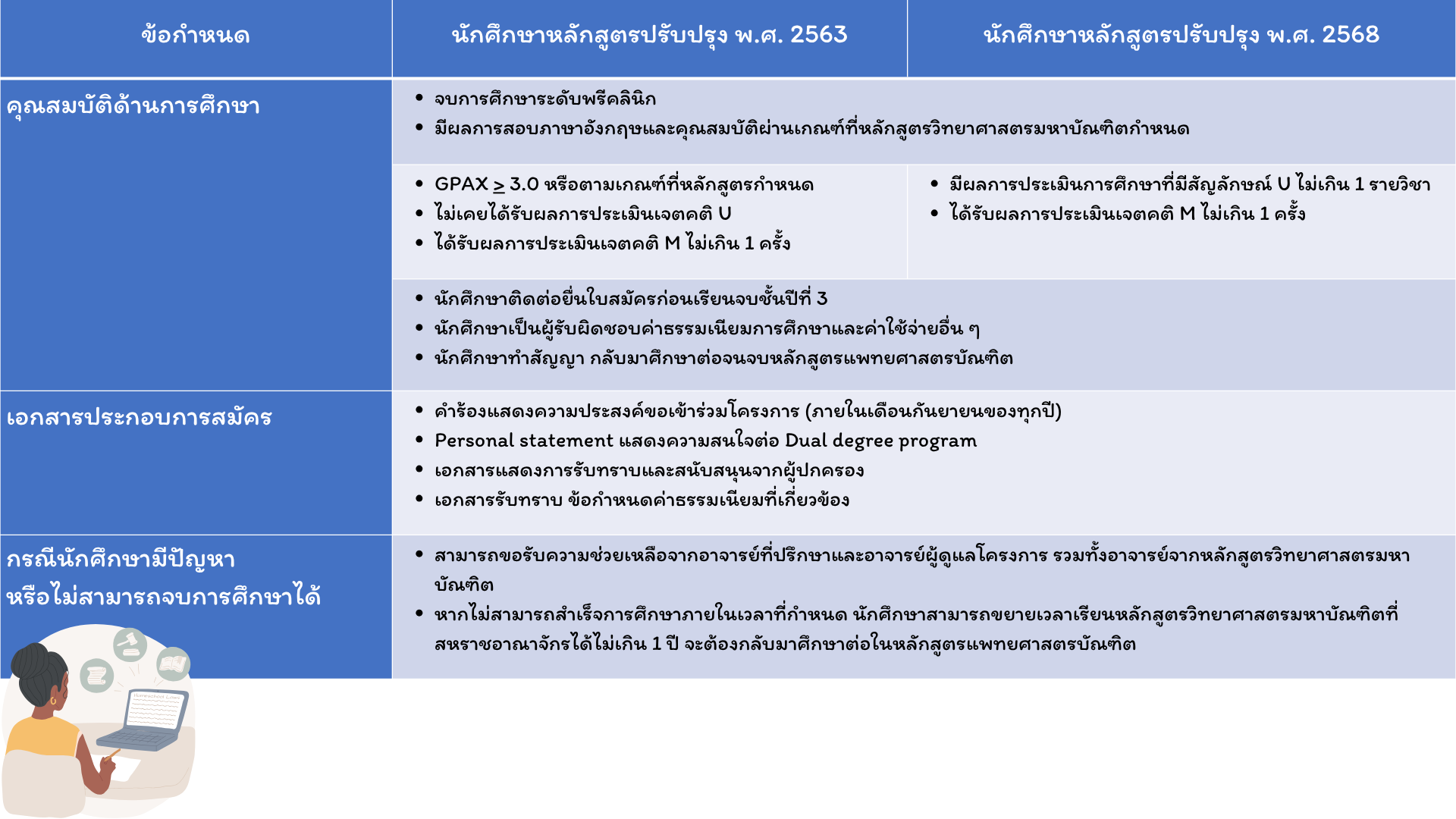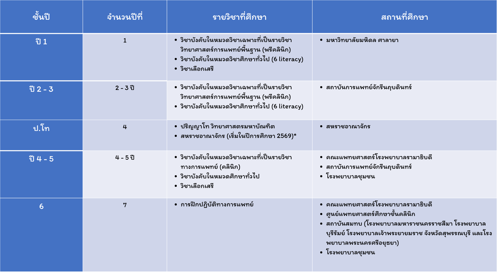 * จะศึกษารายวิชาของหลักสูตรแพทยศาสตรบัณฑิต ชั้นปีที่ 4 บางส่วนก่อนเริ่มเรียนปริญญาโท