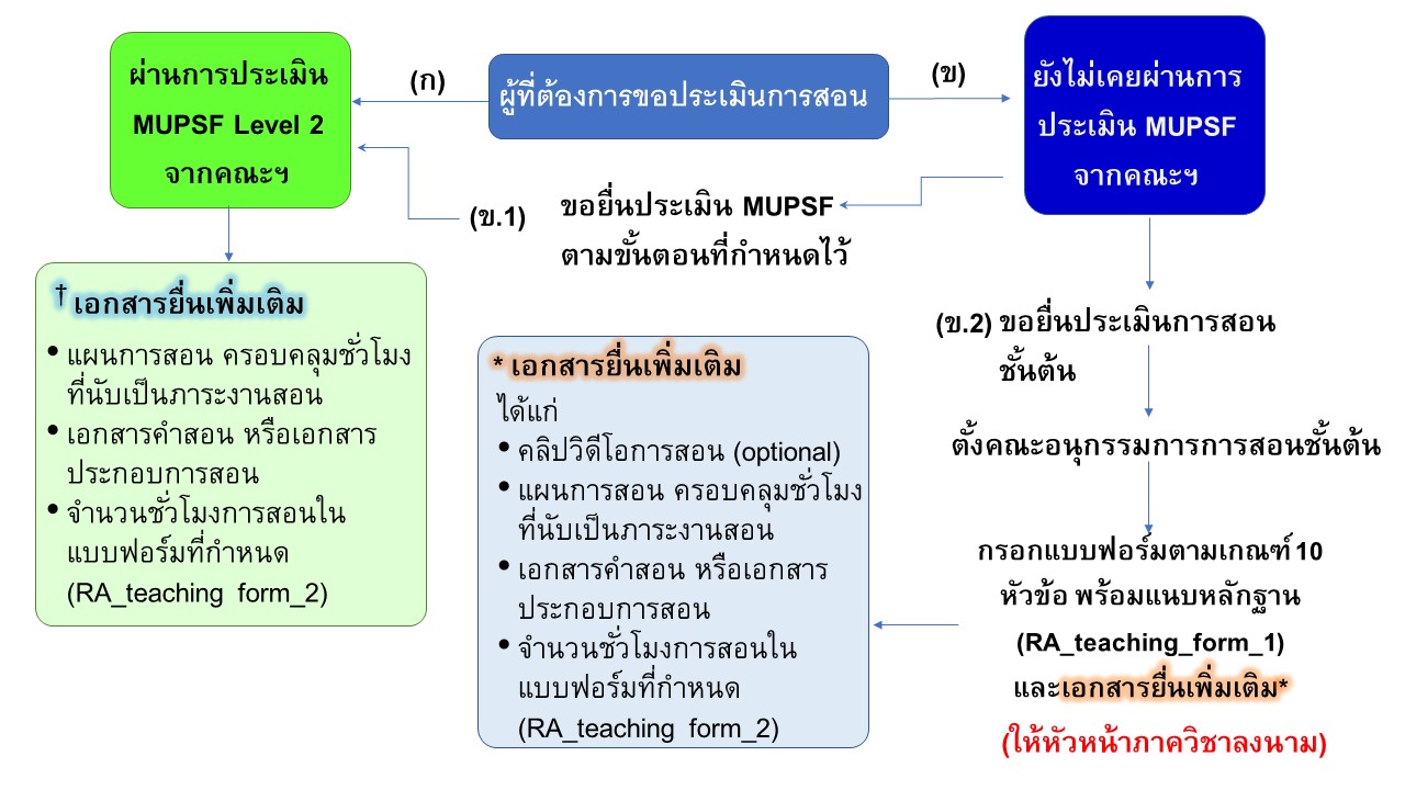 หมายเหตุ สำหรับอาจารย์ที่ผ่านการประเมิน MUPSF Level 2 ใช้แบบฟอร์มเดียวกันโดยไม่ต้องกรอกข้อมูลตามเกณฑ์ 10 ข้อ (RA_Teaching_Form 1) - แบบฟอร์มนับชั่วโมงสอนเทียบหน่วยกิต (RA_Teaching_2)